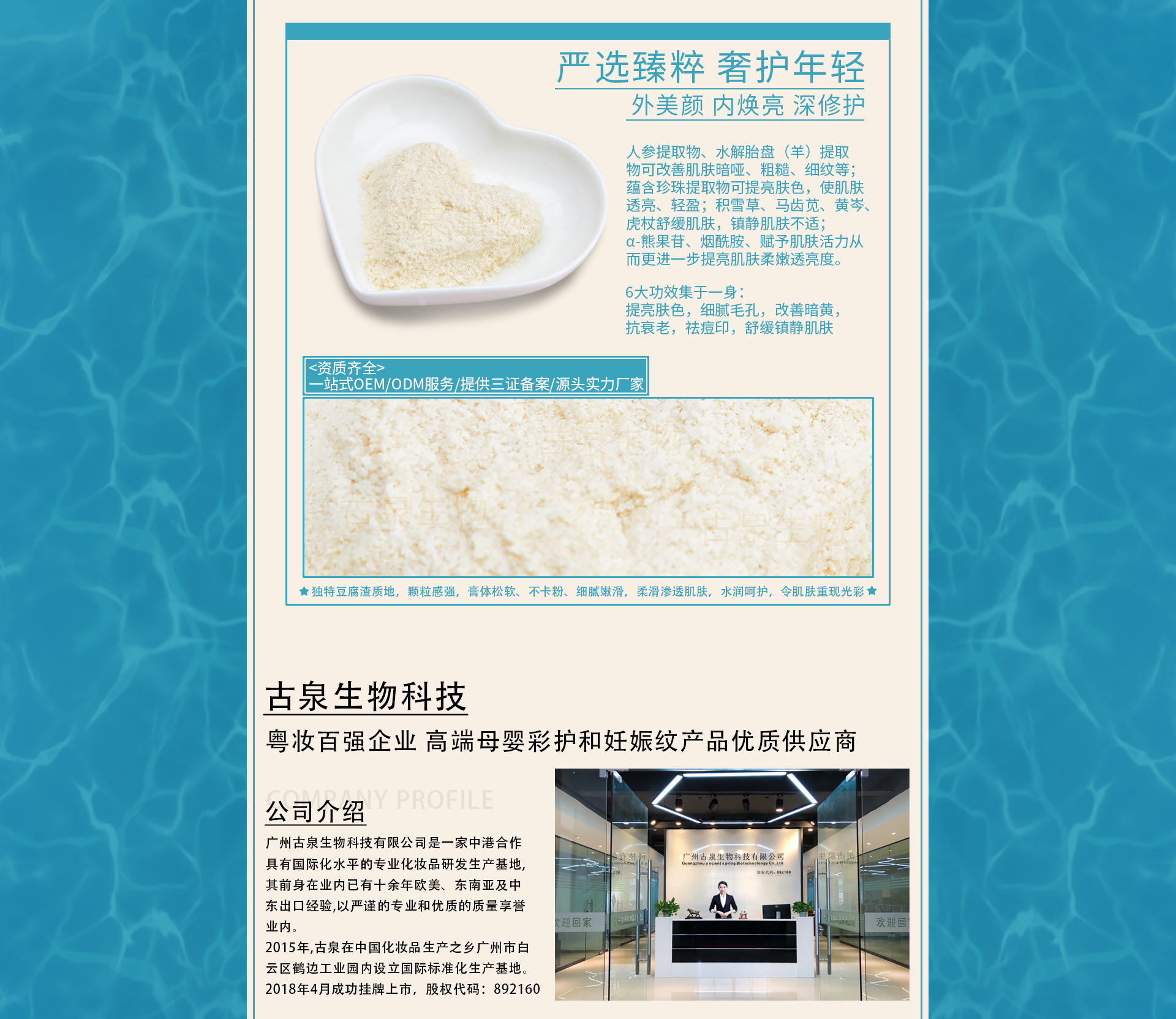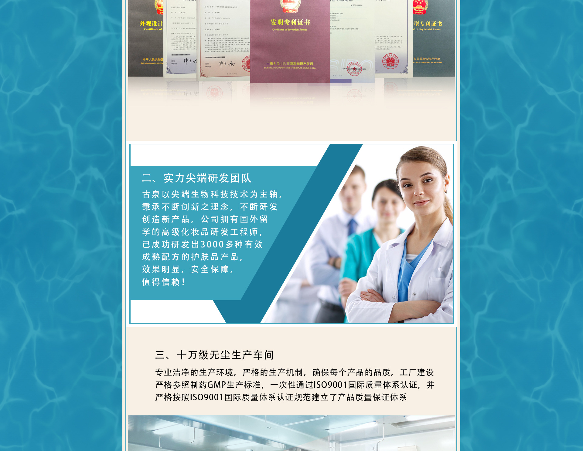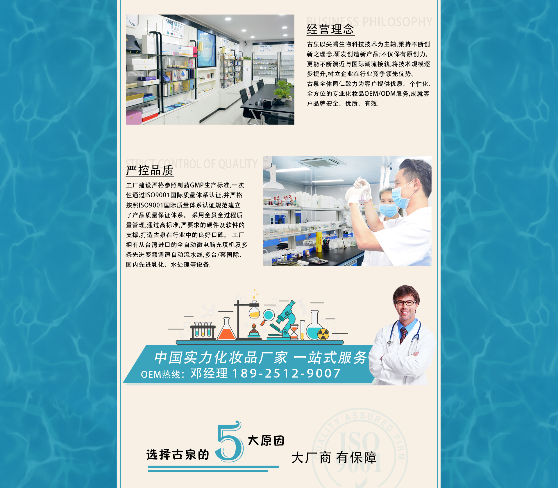 廣州古泉生物科技有限公司是一家中港合作具有國(guó)際化水平的專業(yè)化妝品研發(fā)生產(chǎn)基地,其前身在業(yè)內(nèi)已有十余年歐美、東南亞及中東出口經(jīng)驗(yàn),以嚴(yán)謹(jǐn)?shù)膶I(yè)和優(yōu)質(zhì)的質(zhì)量享譽(yù)業(yè)內(nèi)。 2015年,古泉在中國(guó)化妝品生產(chǎn)之鄉(xiāng)廣州市白云區(qū)鶴邊工業(yè)園內(nèi)設(shè)立國(guó)際標(biāo)準(zhǔn)化生產(chǎn)基地。 工廠建設(shè)嚴(yán)格參照制藥GMP生產(chǎn)標(biāo)準(zhǔn),一次性通過(guò)ISO9001國(guó)際質(zhì)量體系認(rèn)證,并嚴(yán)格按照ISO9001國(guó)際質(zhì)量體系認(rèn)證規(guī)范建立了產(chǎn)品質(zhì)量保證體系。 采用全員全過(guò)程質(zhì)量管理,通過(guò)高標(biāo)準(zhǔn),嚴(yán)要求的硬件及軟件的支撐,打造古泉在行業(yè)中的良好口碑。 工廠擁有從臺(tái)灣進(jìn)口的全自動(dòng)微電腦充填機(jī)及多條先進(jìn)變頻調(diào)速自動(dòng)流水線,多臺(tái)/套國(guó)際、國(guó)內(nèi)先進(jìn)乳化、水處理等設(shè)備。 古泉以尖端生物科技技術(shù)為主軸,秉持不斷創(chuàng)新之理念,研發(fā)創(chuàng)造新產(chǎn)品;不僅保有原創(chuàng)力,更能不斷演近與國(guó)際潮流接軌,將技術(shù)規(guī)模逐步提升,樹(shù)立企業(yè)在行業(yè)競(jìng)爭(zhēng)領(lǐng)先優(yōu)勢(shì)。