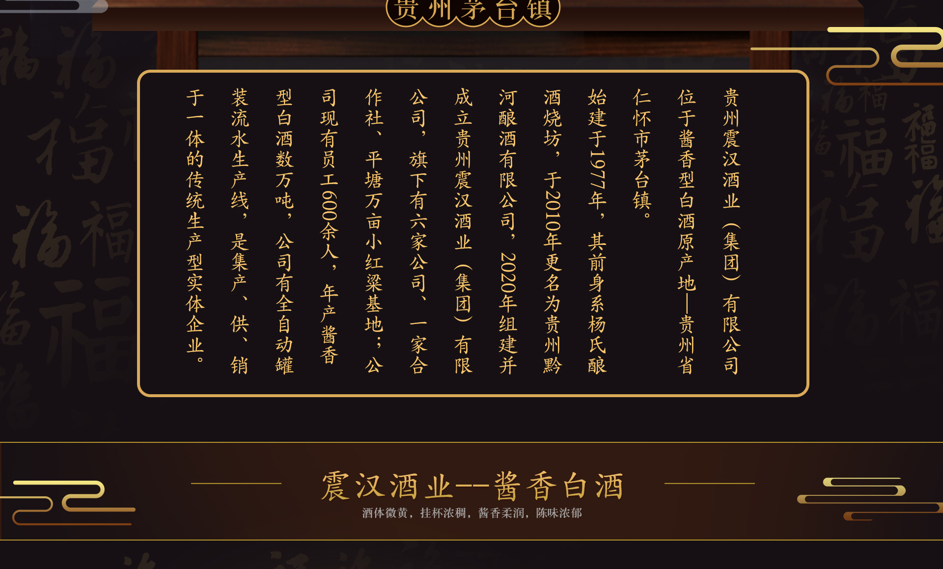 貴州震漢酒業(集團)有限公司是醬香型白酒等產品生產加工的公司。貴州震漢酒業(集團)有限公司位于醬香型白酒原產地——貴州省仁懷市茅臺鎮。始建于1977年,其前身系楊氏釀酒燒坊,于2010年更名為貴州黔河釀酒有限公司,2020年組建并成立貴州震漢酒業(集團)有限公司,旗下有:貴州仁懷黔河釀酒有限公司、仁懷市瑞都釀酒作坊、貴州震漢酒業銷售有限公司、貴州仁懷醉坊醇有限公司、仁懷市震達商貿有限公司、仁懷市大頭種植合作社、平塘萬畝小紅粱基地;公司現有員工600余人,年產醬香型白酒數萬噸;技術力量雄厚,生產設備檢測儀器。 公司有全自動罐裝流水生產線,是集產、供、銷于一體的傳統生產型實體企業。 公司在茅臺鎮有醬香型白酒釀酒基地,本地紅櫻子糯高粱、小麥、赤水河河水為原料,氣候、土壤、水質以及微生物環境等;堅守傳統工藝精釀,長期貯存,匠心勾調;公司旗下品牌有震漢老酒、九尊魅醬、創名貴、名貴美等眾多系列