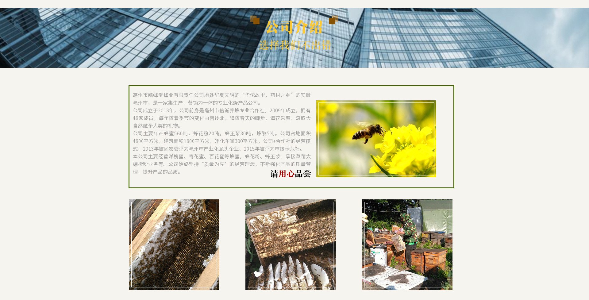 亳州市皖蜂堂蜂業有限責任公司位于三朝古都,華佗故里,中國歷史文化名城,安徽省亳州市。亳州市皖蜂堂蜂業有限責任公司是蜂蜜,蜂蜜制品,為主的生產加工批發零售企業。產品暢銷消費者市場,在消費者當中享有較高的地位,公司與多家零售商和代理商建立了長期穩定的合作關系。擁有完整、科學的質量管理體系。亳州市皖蜂堂蜂業有限責任公司的誠信、實力和產品質量獲得業界的認可。歡迎各界朋友蒞臨參觀、指導和業務洽談。