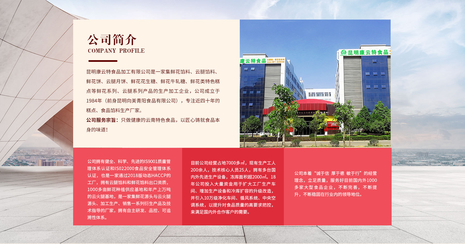 昆明康云特食品加工有限公司是一家集鮮花餡料、云腿餡料、鮮花餅、云腿月餅、鮮花花生糖、鮮花牛軋?zhí)?、鮮花類特色糕點等鮮花系列、云腿系列產(chǎn)品的生產(chǎn)加工企業(yè),公司成立于1984年(前身昆明向美青陽食品有限公司),是云南省少數(shù)堅持、專一、專注近四十年的糕點、食品餡料生產(chǎn)廠家。 公司服務(wù)宗旨:只做健康的云南特色食品,以匠心鑄就食品本身的味道! 公司擁有健全、科學(xué)、先進的IS9001質(zhì)量管理體系認(rèn)證和IS022000食品安全管理體系認(rèn)證,有1000多畝的鮮花種植供應(yīng)基地和年產(chǎn)上萬噸的云火腿基地,是一家集鮮花源頭與云火腿源頭、加工生產(chǎn)、銷售一系列衍生產(chǎn)品及技術(shù)指導(dǎo)的廠家,擁有自主研發(fā)、品控、可追溯性體系。 目前公司經(jīng)營占地7000多㎡,現(xiàn)有生產(chǎn)工人200余人,技術(shù)核心人員25人,擁有多臺國內(nèi)外先進生產(chǎn)設(shè)備,凍庫面積超2000㎡。18年公司投入大量資金用于擴大工廠生產(chǎn)車間、增加生產(chǎn)設(shè)備和冷庫擴容的升級改造,