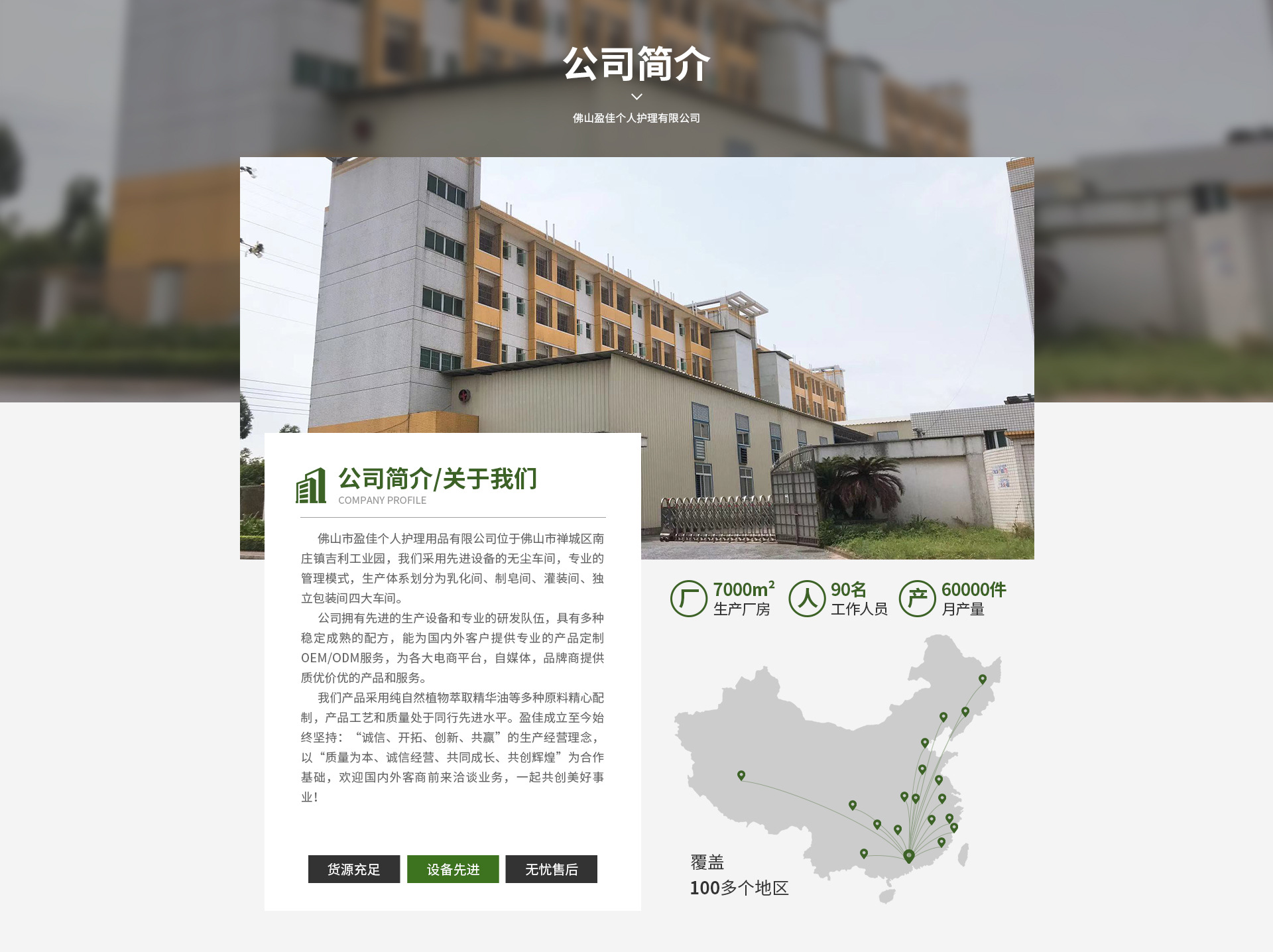 公司位于佛山市禪城區南莊鎮吉利工業園,占地2000平方,擁有先進的生產設備和專業的研發隊伍,具有多種穩定成熟的配方,主營手工皂系列的品牌和貼牌產品,能為國內外客戶提供專業的產品定制服務,月最大產能為50噸,為各大電商平臺,自媒體,品牌商提供質優價優的產品和服務。 我們產品采用多種天然原料精心配制,產品工藝和質量處于同行領先水平。盈佳成立至今始終堅持:“誠信、開拓、創新、共贏”的生產經營理念,以“質量為本、誠信經營、共同成長、共創輝煌”為合作基礎,歡迎國內外客商前來洽談業務,一起共創美好事業!