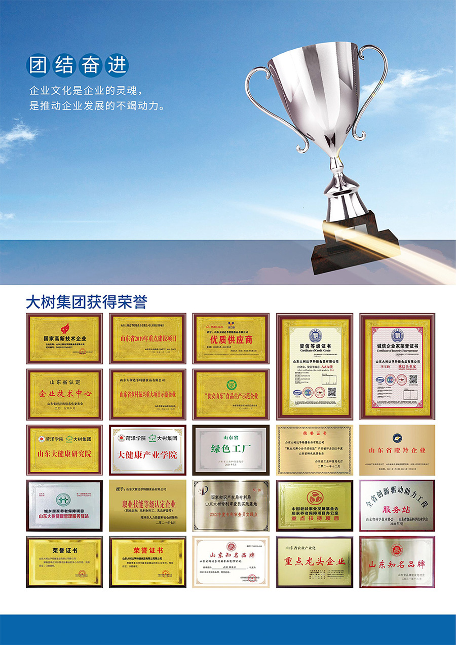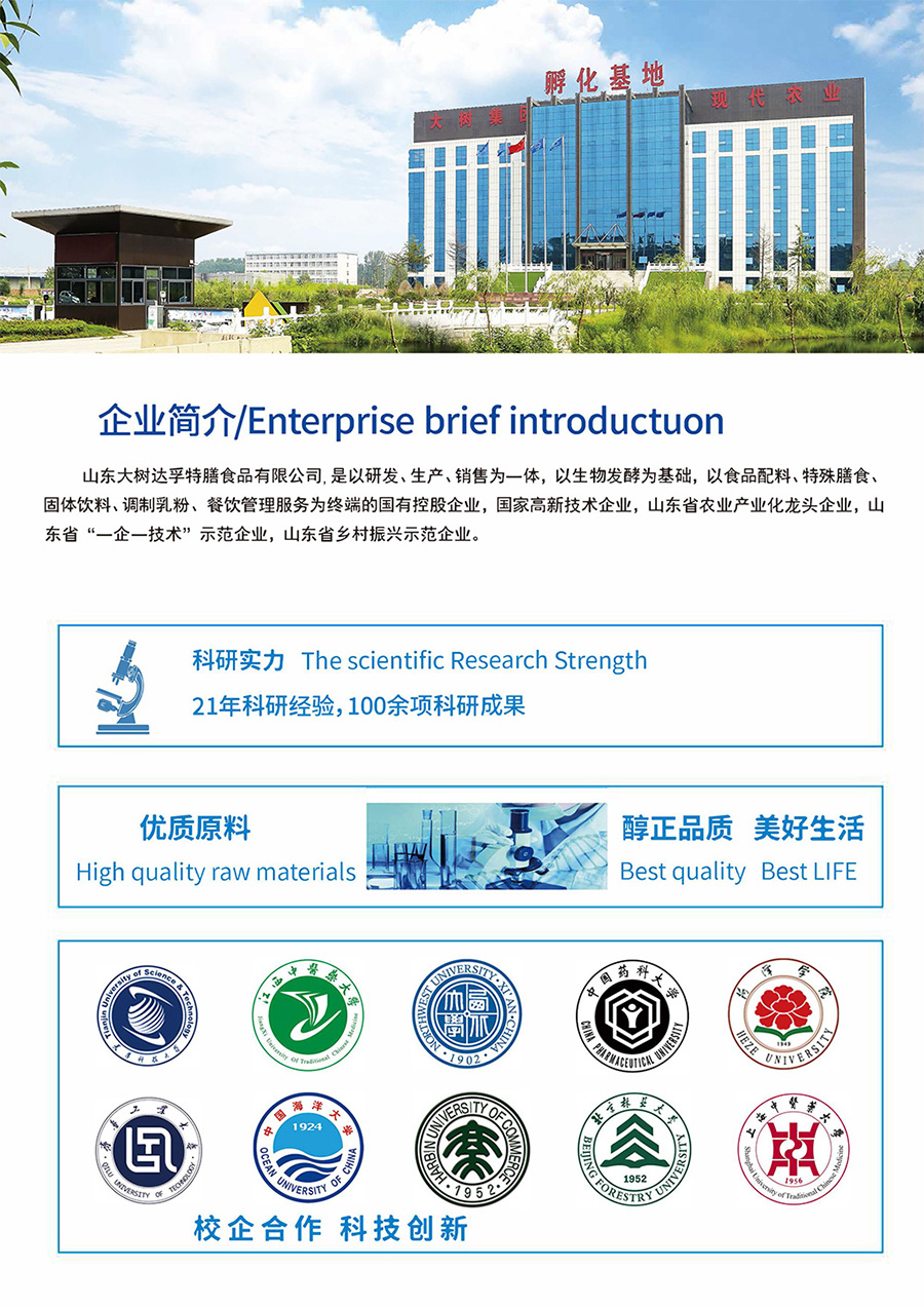 山東大樹達(dá)孚特膳食品有限公司是以研發(fā)、生產(chǎn)、銷售為一體,以生物發(fā)酵為基礎(chǔ),以食品配料、特殊膳食、固體飲料、調(diào)制乳粉、餐飲管理服務(wù)為終端的國有控股企業(yè),國家高新技術(shù)企業(yè),山東省農(nóng)業(yè)產(chǎn)業(yè)化龍頭企業(yè),山東省“一企一技術(shù)”示范企業(yè),山東省鄉(xiāng)村振興示范企業(yè)。