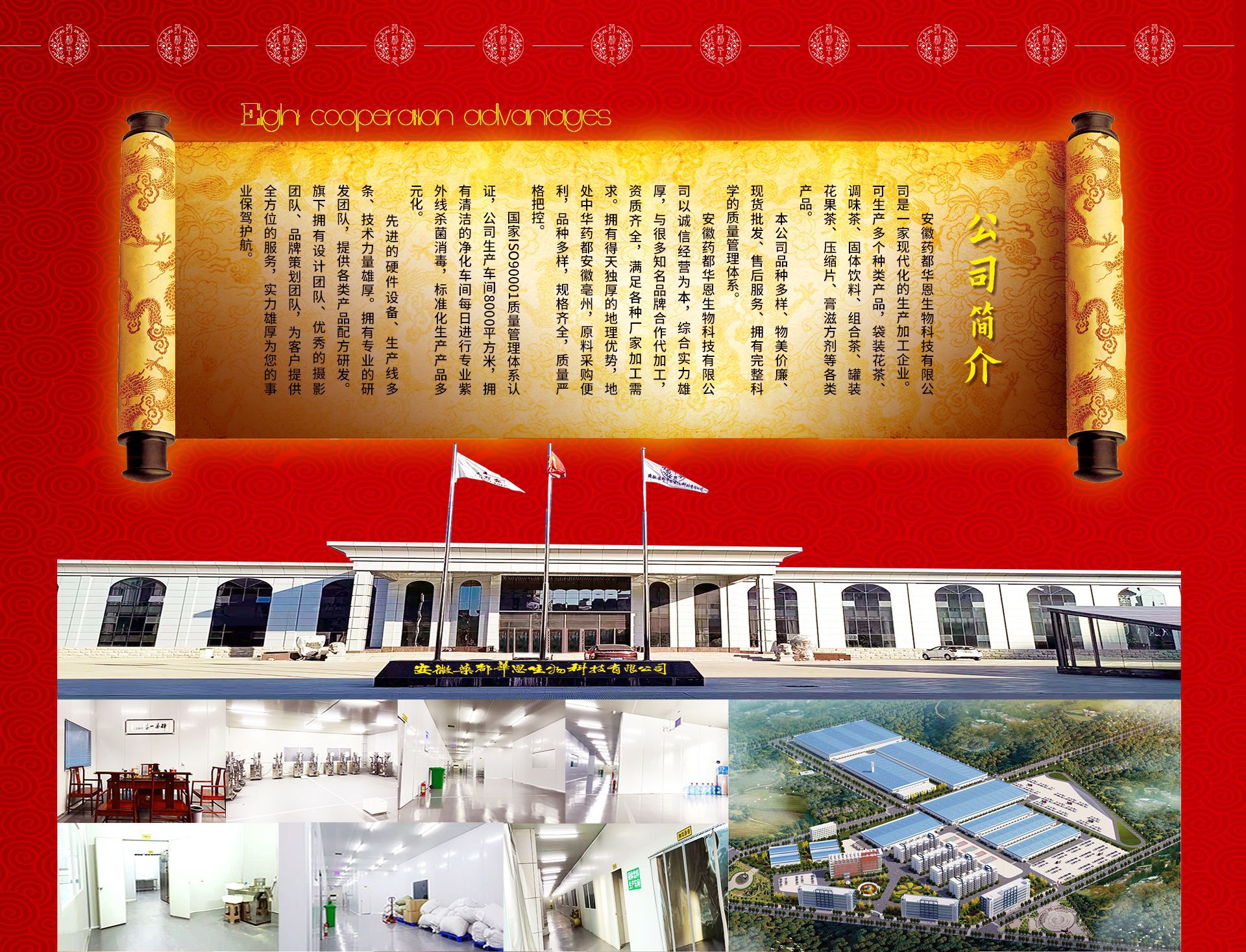安徽藥都華恩生物科技有限公司是袋泡茶、花草茶、壓片糖果等產(chǎn)品專業(yè)生產(chǎn)加工的公司,擁有完整、科學(xué)的質(zhì)量管理體系。安徽藥都華恩生物科技有限公司的誠信、實力和產(chǎn)品質(zhì)量獲得業(yè)界的認可。歡迎各界朋友蒞臨參觀、指導(dǎo)和業(yè)務(wù)洽談。
