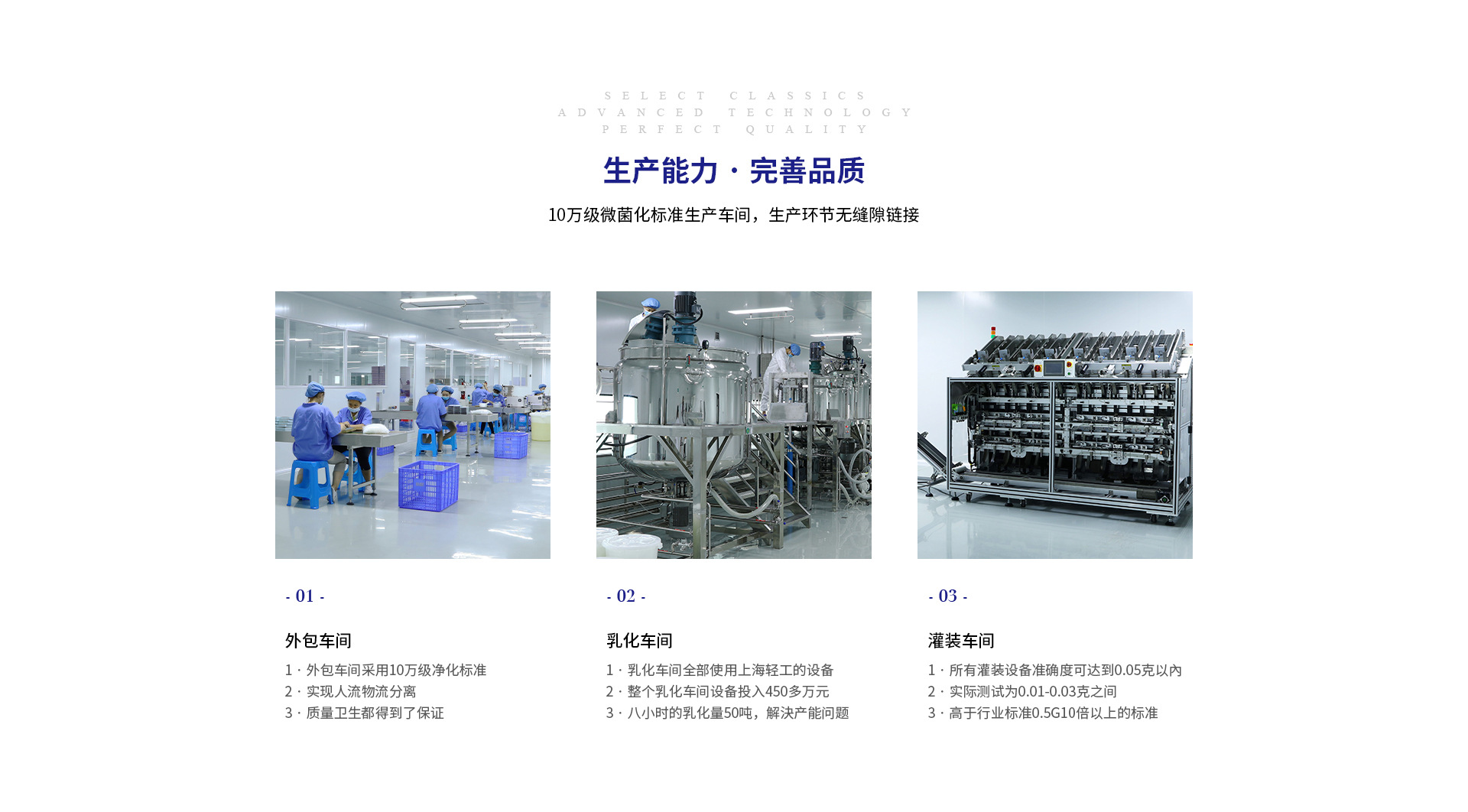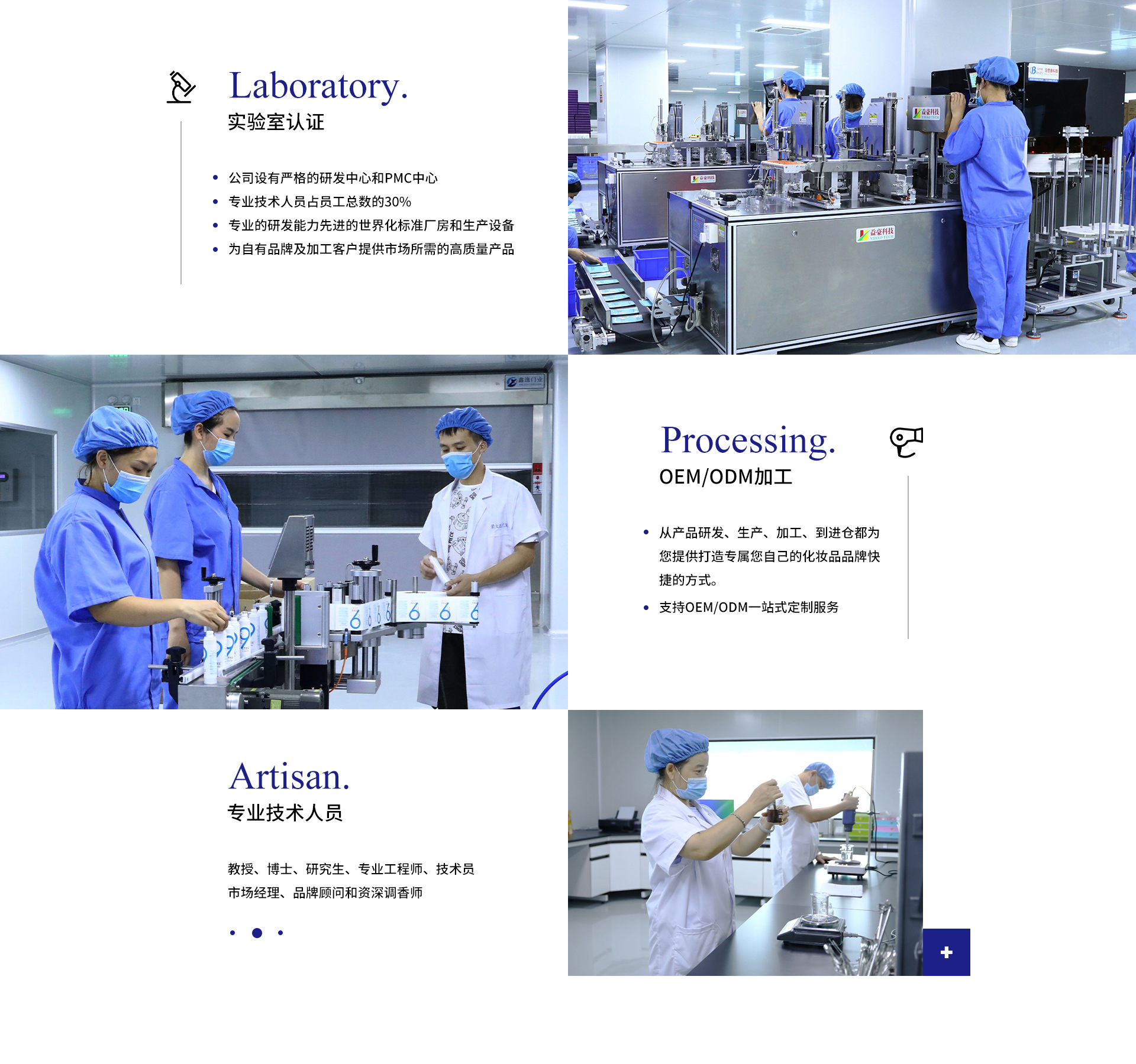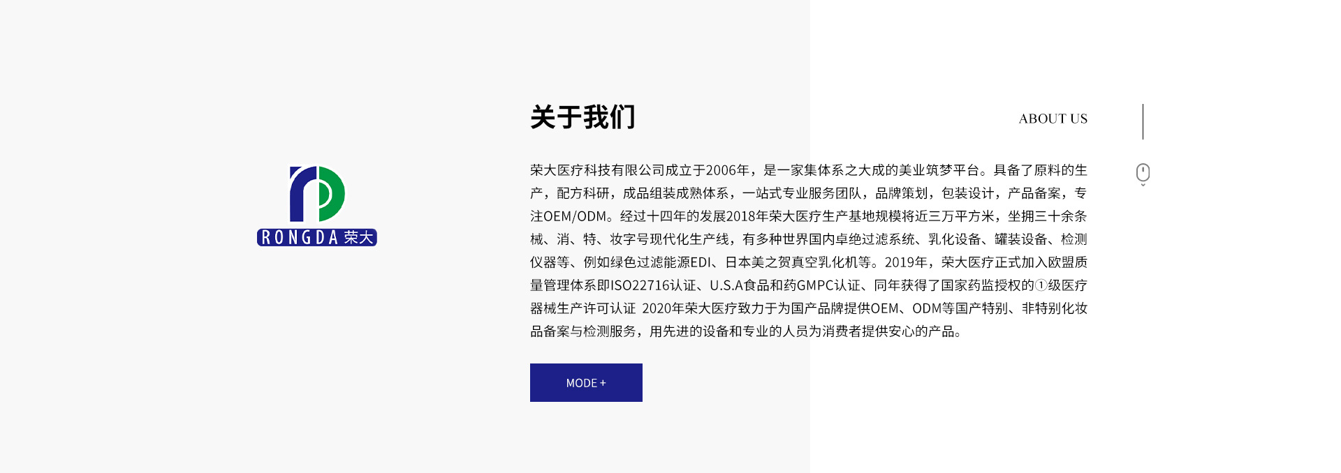 榮大醫療科技有限公司成立于2006年,是一家集體系之大成的美業筑夢平臺。具備原料生產,配方科研,成品組裝等成熟體系,一站式專業服務團隊,品牌策劃,包裝設計,產品備案,專注OEM/ODM。 經過十四年的發展2018年榮大醫療生產基地規模將近三萬平方米,坐擁三十余條械、消、特、妝字號現代化生產線,有多種國際國內頂尖過濾系統、乳化設備、罐裝設備、檢測儀器等、例如綠色過濾能源EDI、日本美之賀真空乳化機等。 2019年,榮大醫療正式加入歐盟質量管理體系即ISO22716認證、美國食品和藥GMPC認證、同年獲得了國家藥監授權的一級醫療器械生產許可認證 2020年榮大醫療致力于為國產品牌提供OEM、ODM等國產特殊、非特殊化妝品備案與檢測服務,用最先進的設備和最專業的人員為消費者提供安全有效的產品