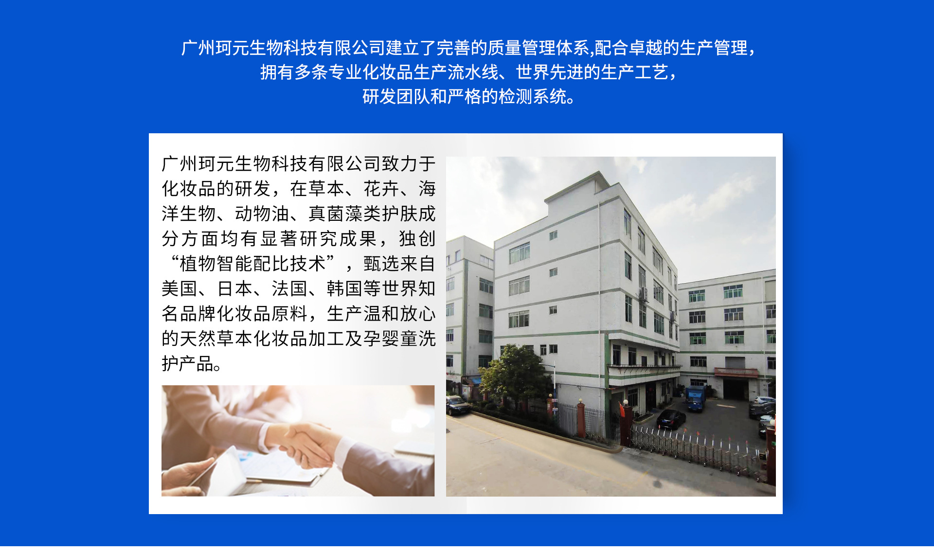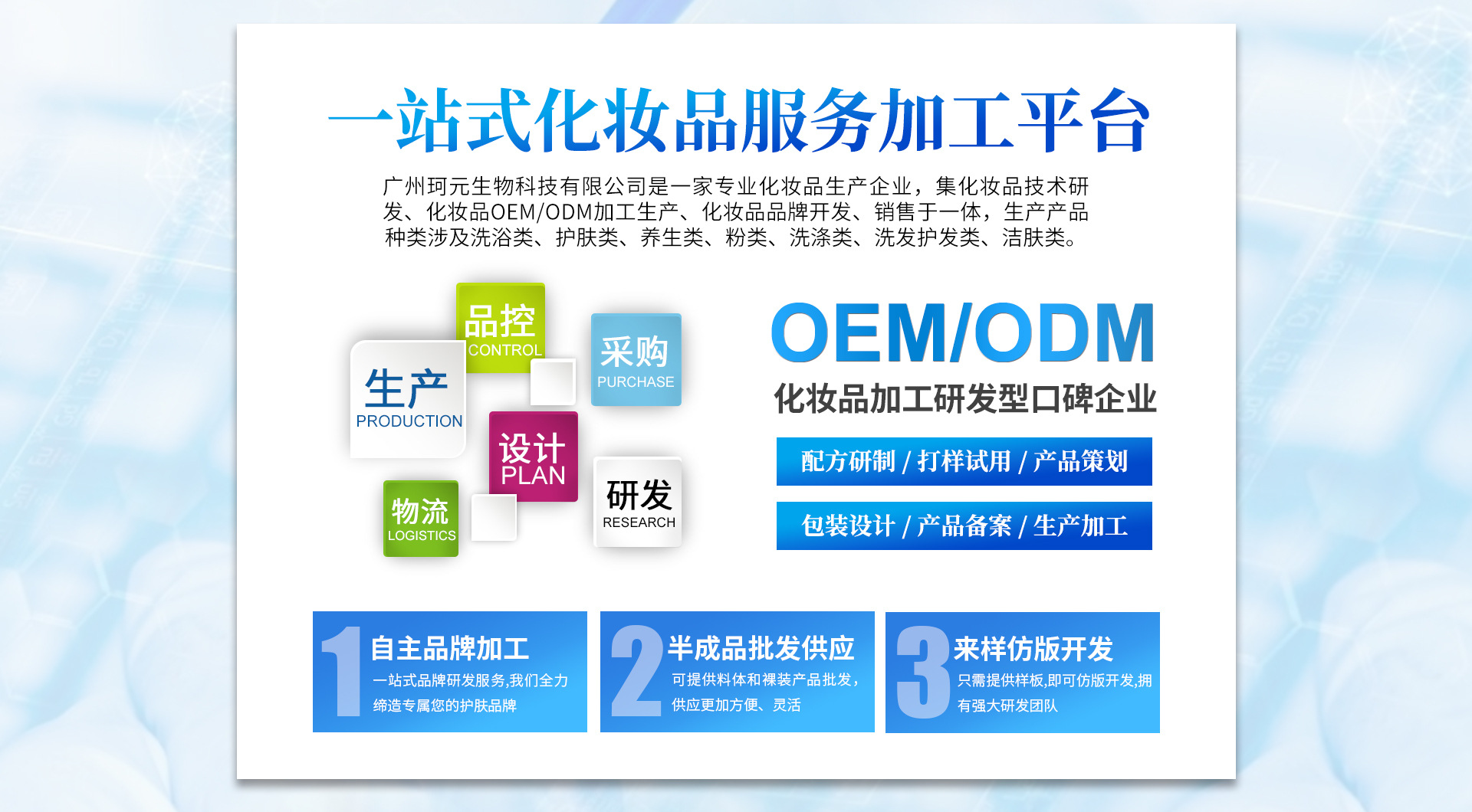 廣州珂元生物科技有限公司位于素有中國最大化妝品生產基地之都的廣州白云區,有利的地域環境和優勢資源為珂元的發展提供了有力保障。公司現與百余個國內、國外知名品牌建立了合作關系,多年的客戶支持,及行業沉淀,使珂元公司吸取了行業之精髓,成為專業的化妝品OEM/ODM制造商