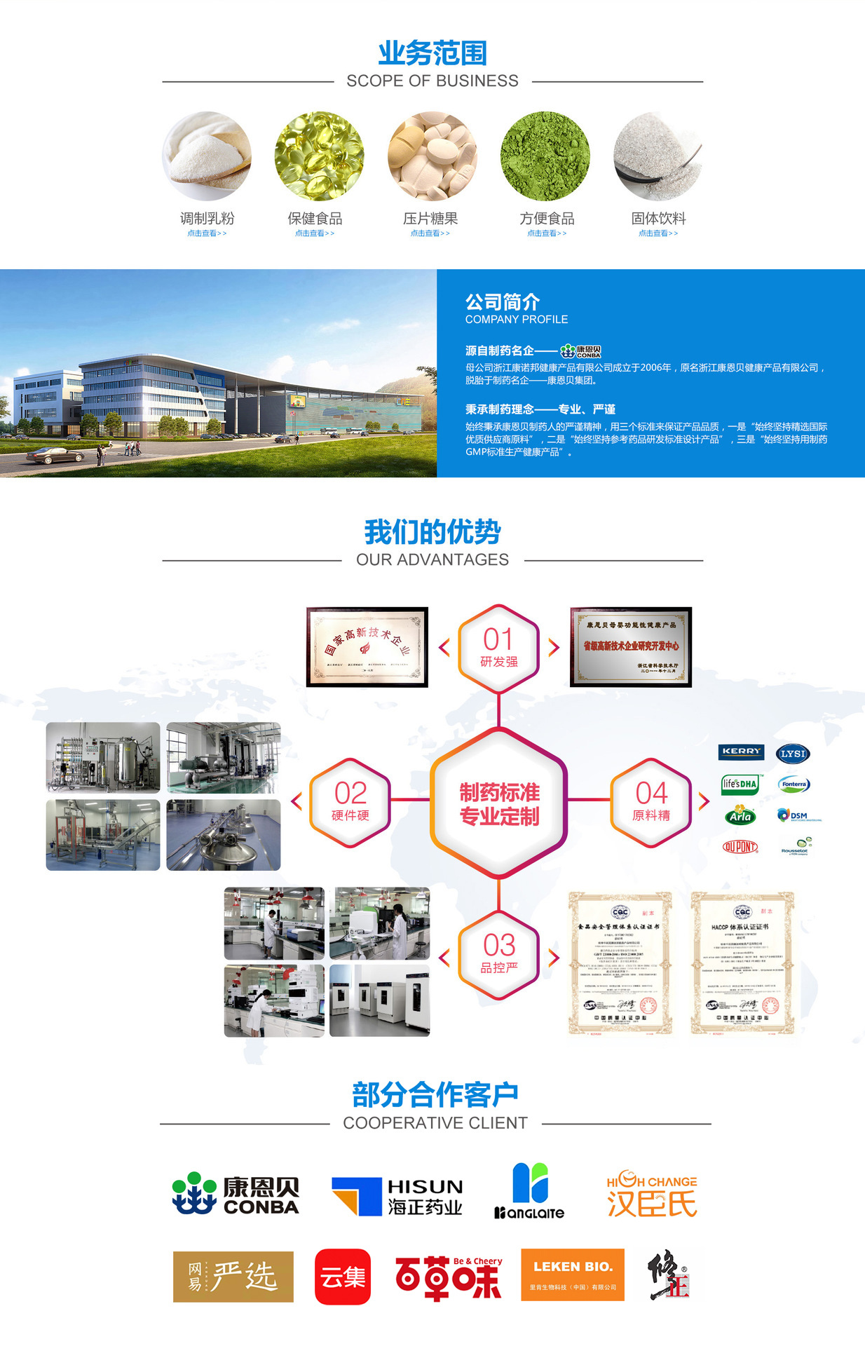 杭州千島湖康諾邦健康產品有限公司源自制藥名企---康恩貝集團。不僅是國家高新技術企業(yè),還建有功能性食品省級研發(fā)中心。 生產基地位于風景秀麗的千島湖畔,離千島湖高鐵站咫尺之遙,總占地100畝,首期約50畝,建筑面積約12000m2,參照藥品GMP制藥標準分別建有獨立符合10萬級潔凈度的食品、保健食品、嬰幼兒配方乳粉生產車間,擁有食品SC、保健食品和嬰幼兒配方乳粉生產許可等資質,并先后通過了乳制品GMP和HACCP雙體系認證。公司食品生產范疇涵括嬰幼兒配方乳粉、調制乳粉、固體飲料、壓片糖果、方便食品等,保健食品可生產片劑、軟膠囊、粉劑等劑型。公司設立專業(yè)的檢測分析中心,配有各類專業(yè)技術人員32名,實驗面積800余m2,有原裝進口的高效液相色譜儀、氣相色譜儀、離子色譜儀和PE原子光譜儀等精密儀器。 專業(yè)研制,貼心服務!千島湖康諾邦,歡迎您惠顧!