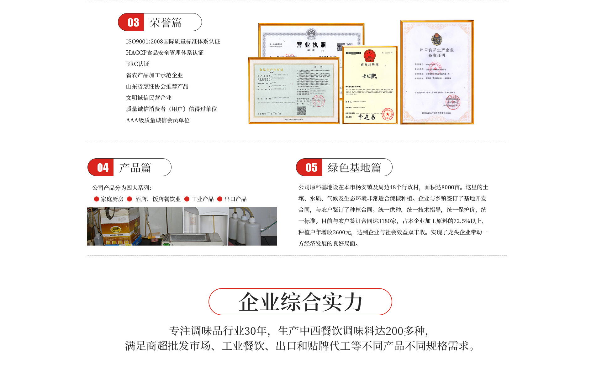 山東龐大調味食品有限公司是我省著名的優秀企業,是德州市級農業產業化龍頭企業。始建于1985年,公司占地86800平方米,新車間落成后建筑面積39500平方米。使用面積15000平方米,公司注冊資金3000萬元,現有員工360人,各類技術人員80人,其中大本生15人,高級管理人員20人。年生產能力20萬噸,產值1.2億,現有固定資產6500萬元。公司生產的“老龐家”牌系列調味品暢銷國內外,產品達一百二十多個品種。2011月3月以會長單位成立“樂陵市工商聯恒信企業互助商會”,一流的產品質量,誠信務實的企業理念,雄厚的技術力量,較高的管理水平,深受國內外廣大客戶的良好贊譽。