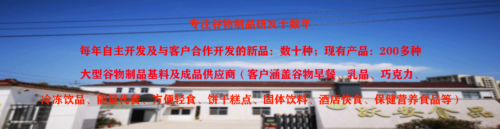 高品質、天然、營養、健康型熟化谷物制品是躍安食品公司的主導產品,是迎合當今社會健康潮流的優質食品配料。躍安食品以專業的開發技術優勢(每年根據營養學考量及客戶要求開發的新品有數十種)和制造設施優勢,以五谷雜糧、果蔬和藥食兼用植物為原料,采用先進的瞬時熟化、殺菌技術,在極短時間將谷物等熟化、干燥。該類產品特點是具有豐富的營養、天然的特征風味,非常適合營養健康、方便快捷、善待味蕾的現代生活方式。