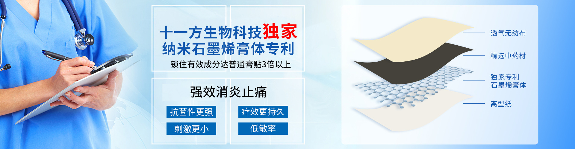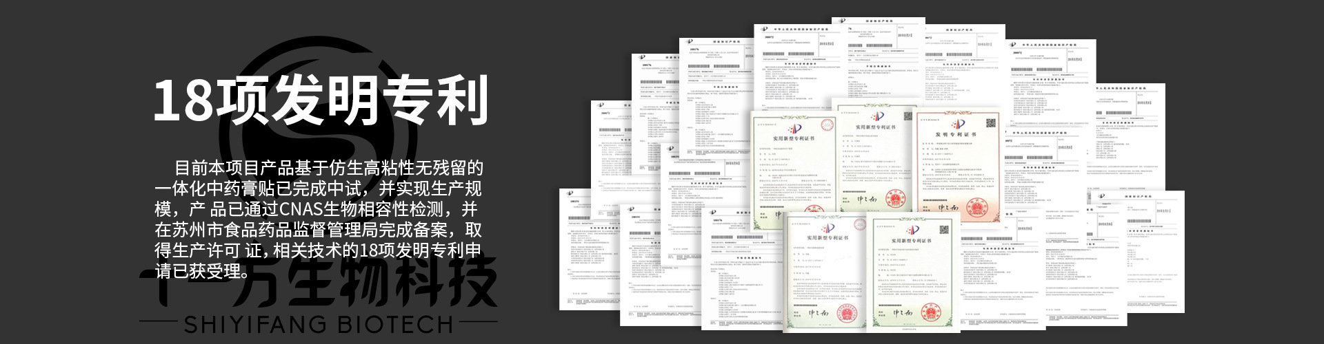 蘇州十一方生物科技有限公司2016年成立,榮獲園區領軍企業,園區科技領軍人才等榮譽證書。坐落于納米科技企業孵化基地-蘇州納米城。擁有十萬級的無塵車間和實驗室。生產設施專業齊全,檢測設備先進完善。致力于開發以石墨烯復合醫用熱熔膠為基底的中藥膏貼。 研發團隊主要成員:蘇鑫,美國達特茅斯學院有機化學博士,研究專長包括生物活性有機小分子和生物醫用高分子材料。武國忠,著名中醫師,結合自己多年臨床實踐經驗,融道家養生、構建了一套全新的適合現代人體質特點的先天醫學體系。 研發團隊歷經三年尋求石墨烯在生物醫療中的應用。 復合石墨烯的熱熔膠基底依靠石墨烯的超大比表面積增大熱熔膠的載藥量,同時起到緩釋載體的功能;石墨烯本身的抑菌特性和生物相容性使得該產品能夠有效減少感染和過敏概率,無需另外加入抗菌藥物,且性質穩定;石墨烯的吸附作用還在一定程度上增強了熱熔膠作為粘結材料本身的粘結性和牢靠性。