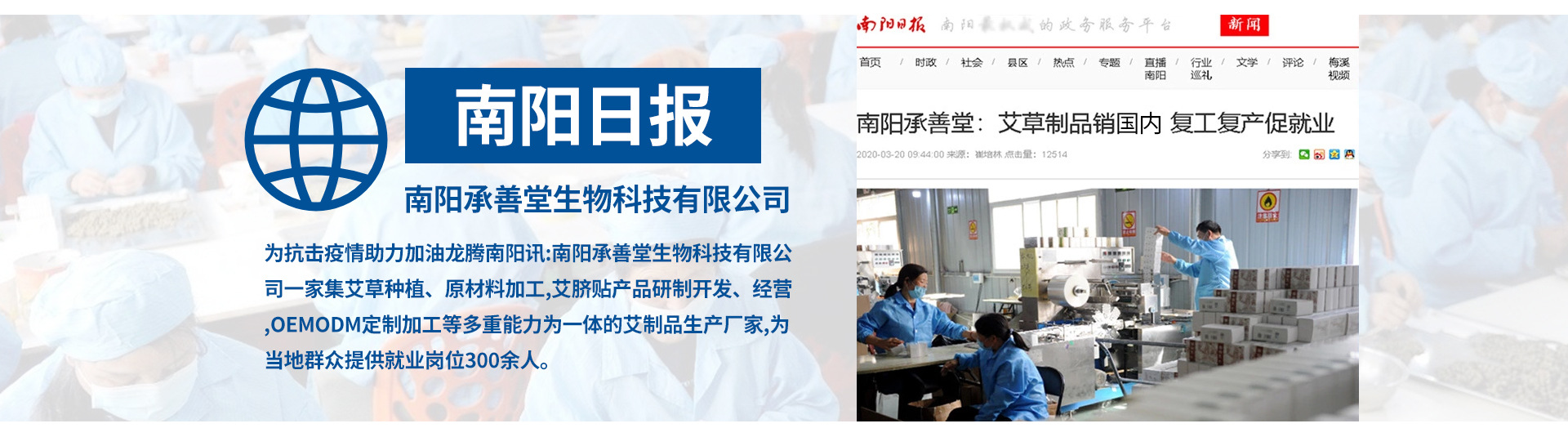 南陽承善堂生物科技有限公司坐落于美麗的“艾草之鄉”河南南陽,這里是醫圣張仲景的故鄉。我公司是一家專注于艾草生物制品的開發咨詢、生產加工、經營銷售為一體的開發企業。我們多年來潛心于艾草及艾灸事業的研究和開發,并加工生產宛艾岐春一系列艾灸產品,將中國傳統艾灸方法與現代技術相結合,弘揚中醫文化,傳承國粹精華,全力打造艾灸行業品牌!