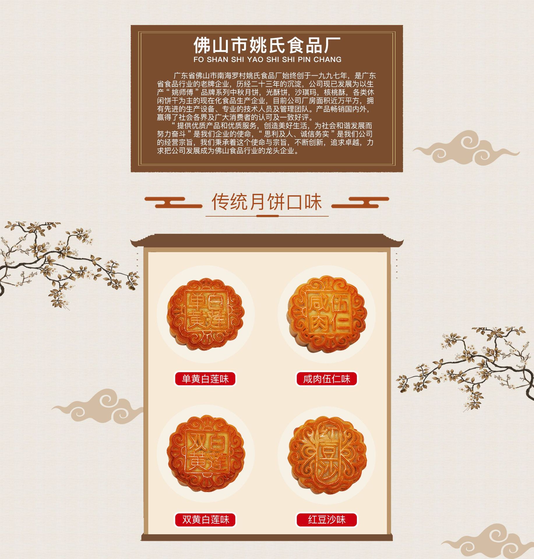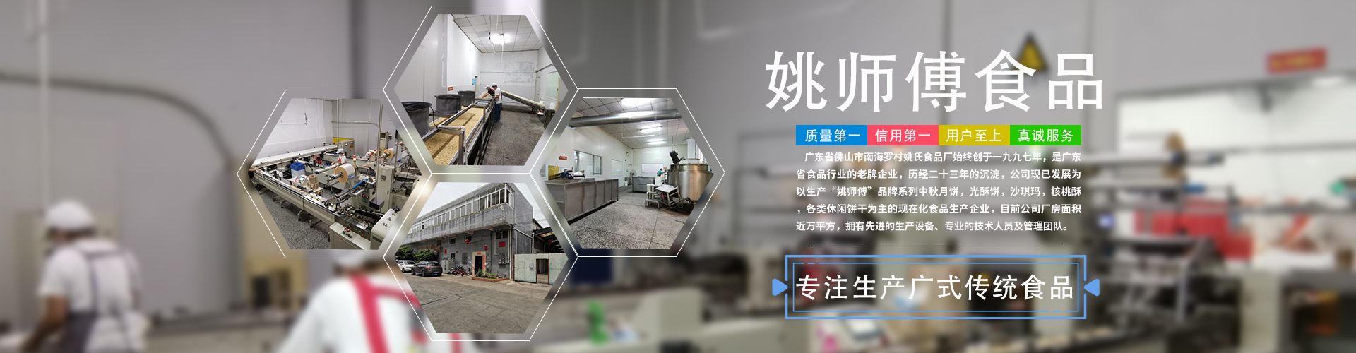 廣東省佛山市南海羅村姚氏食品廠始終創于一九九七年,是廣東省食品行業的老牌企業,歷經二十三年的沉淀,公司現已發展為以生產“姚師傅”品牌系列中秋月餅,光酥餅,沙琪瑪,核桃酥,各類休閑餅干為主的現在化食品生產企業,目前公司廠房面積近萬平方,擁有先進的生產設備、專業的技術人員及管理團隊。產品暢銷國內外,贏得了社會各界及廣大消費者的認可及一致好評。 “提供優質產品和優質服務,創造美好生活,為社會和諧發展而努力奮斗”是我們企業的使命,“思利及人、誠信務實”是我們公司的經營宗旨,我們秉承著這個使命與宗旨,不斷創新,追求卓越,力求把公司發展成為佛山食品行業的龍頭企業。