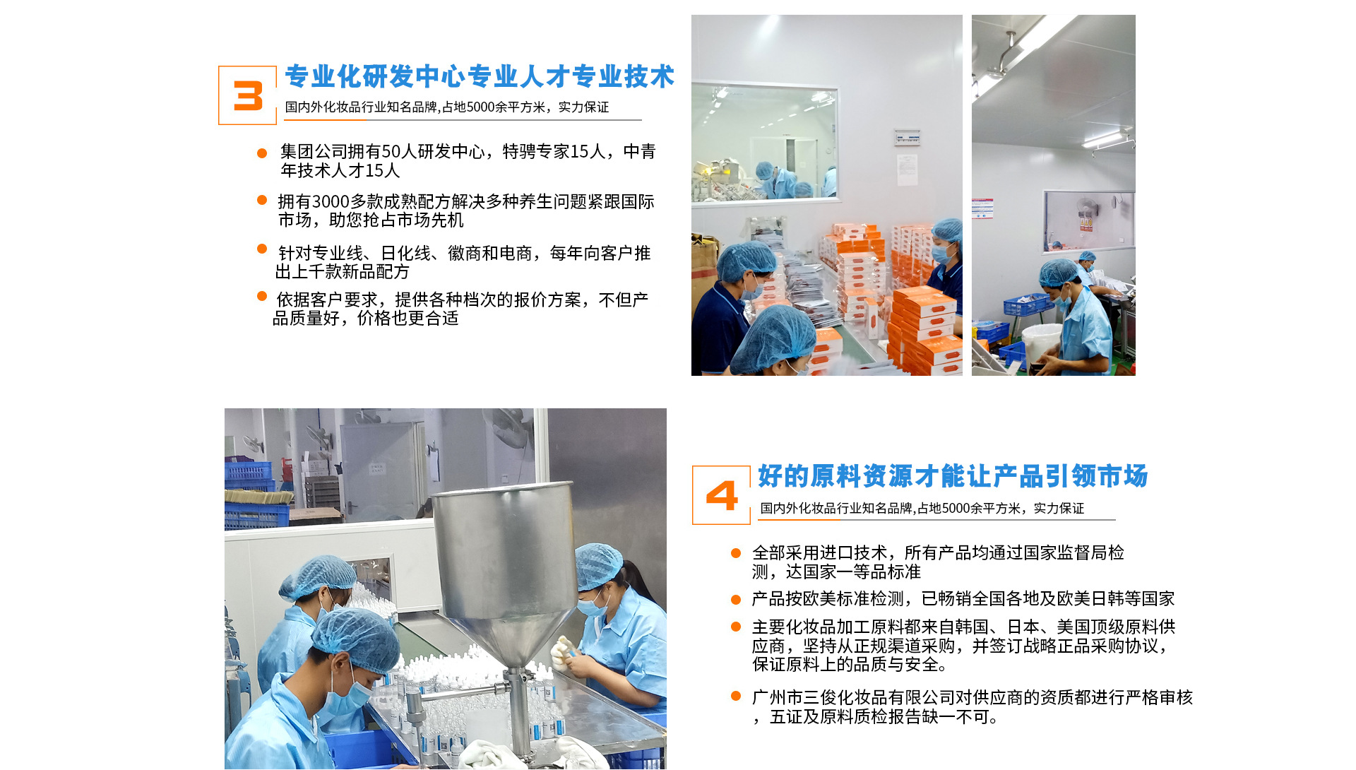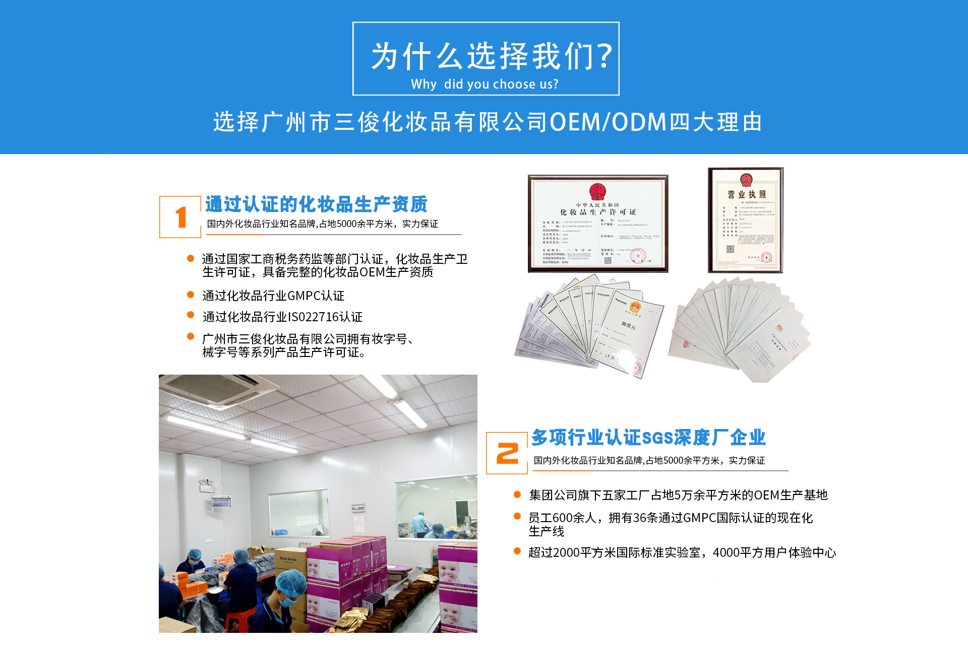 廣州市三俊化妝品有限公司,成立于2000年,位于白云區(qū)占地面積五干多平方米,通過國家藥監(jiān)局生產(chǎn)許可資質(zhì)認證,擁有先進研發(fā)設(shè)備,高素質(zhì)科研人才,為客戶提供全方位,個性化的OEM/ODM服務(wù),公司擁有完整的ERP系統(tǒng),可隨時監(jiān)控生產(chǎn)進度完善的品質(zhì)質(zhì)量管理體系,可時時監(jiān)控生產(chǎn)品質(zhì),不斷進行技術(shù)創(chuàng)新,研發(fā)安全有效的高品質(zhì)產(chǎn)品,為客戶實現(xiàn)品牌價值和市場價值。