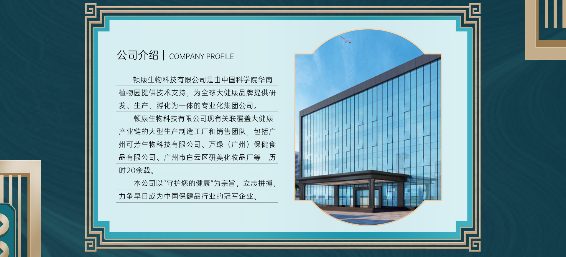 頓康生物科技有限公司是由中國科學院華南植物園提供技術支持,為全球大健康品牌提供研發、生產、孵化為一體的專業化集團公司。 頓康生物科技有限公司現有關聯覆蓋大健康產業的大型生產制造工廠和銷售團隊,包括;萬綠(廣州)保健食品有限公司、廣州可芳生物科技有限公司、廣州白云區研美化州品廠等,歷時20余載。 本公司以“守護您的健康”為宗旨,立志拼搏力爭早日成為保健食品行業的冠軍企業。