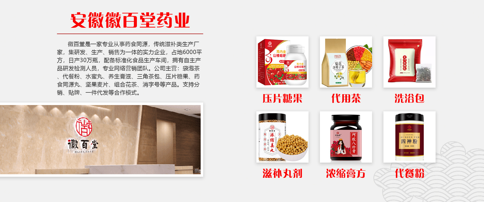 安徽徽百堂藥業有限公司自有生產線,生產區域占地5000平方米。擁有豐富的生產經驗,先進的標準化設備 ,食品級凈化車間。集代餐粉、濃縮膏滋、代用茶、壓片糖果、方便食品等產品線。