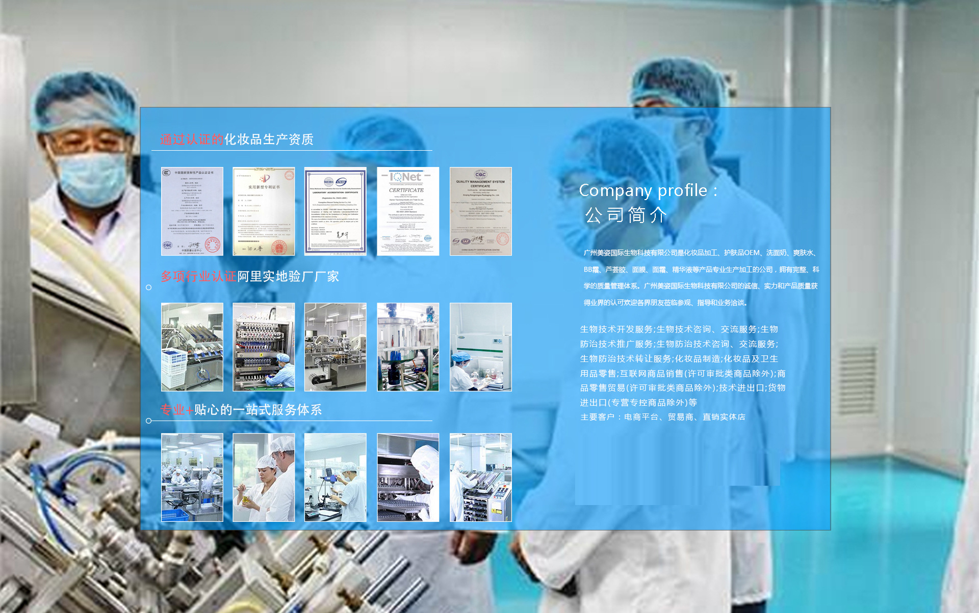 廣州美姿國際生物科技有限公司是化妝品加工、護膚品OEM、洗面奶、爽膚水、BB霜、蘆薈膠、面膜、面霜、精華液等產品專業生產加工的公司,擁有完整、科學的質量管理體系。廣州美姿國際生物科技有限公司的誠信、實力和產品質量獲得業界的認可。歡迎各界朋友蒞臨參觀、指導和業務洽談。