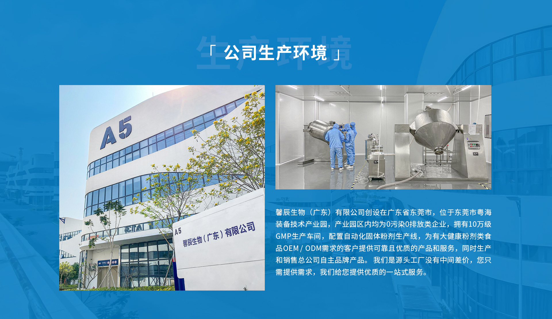 馨辰生物創設在廣東省東莞市,公司著力引進先進生產設備,堅持嚴格的品控管理標準,提供專業的多方位品牌代加工服務,整合資源為終端客戶提供巨大的附加價值。 馨辰生物擁有10萬級GMP生產車間,配置自動化固體粉劑生產線,同時領有產品研發團隊、設計師團隊、營養師團隊等龐大人才隊伍,致力于為有大健康粉劑類食品OEM/ODM需求的客戶提供可靠且優質的產品和服務,同時生產和銷售公司總部自主品牌產品。