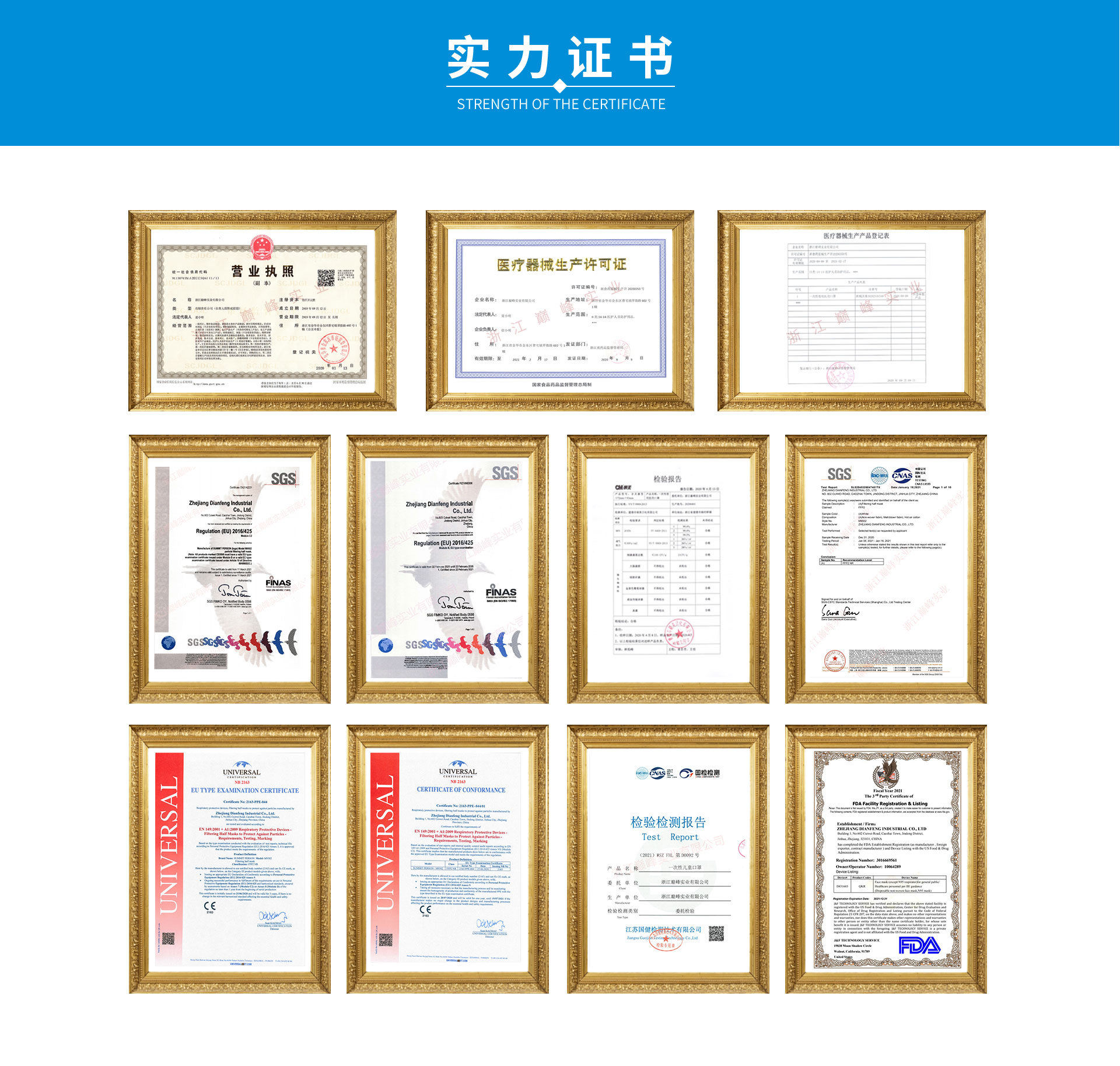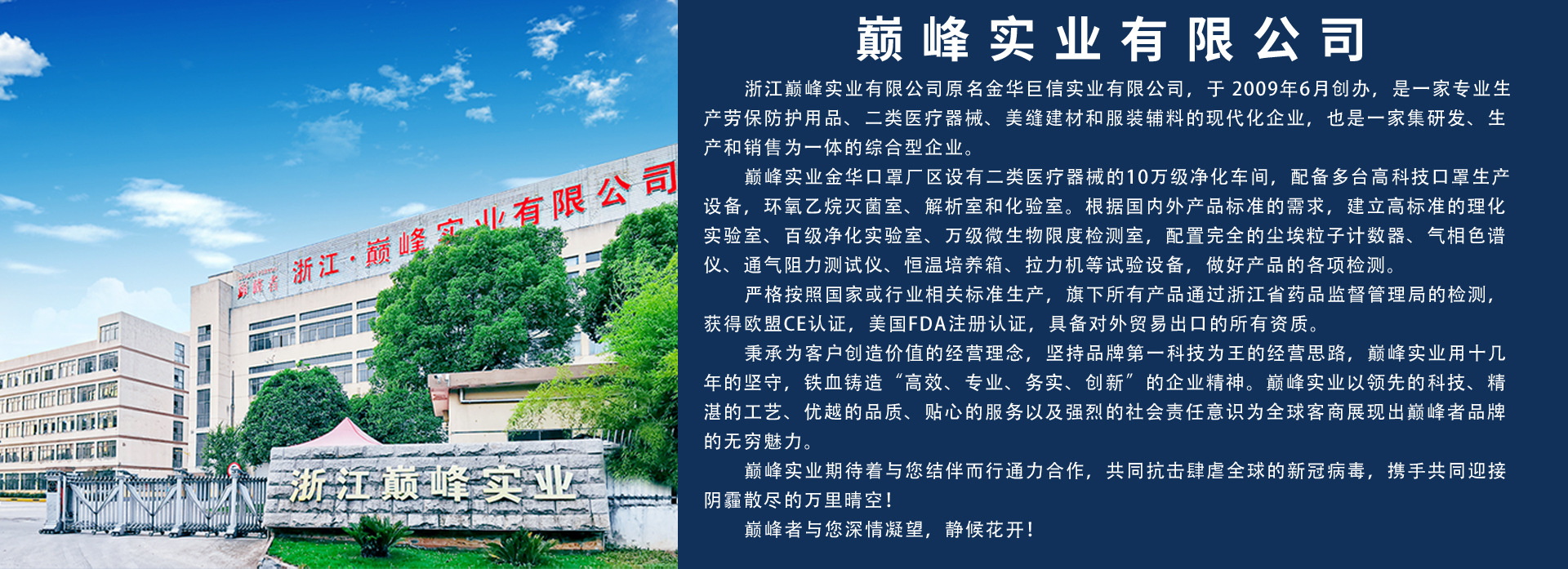 浙江巔峰實業有限公司原名金華巨信實業有限公司,于 2009年6月創辦,是一家專業生產勞保防護用品、二類醫療器械、美縫建材和服裝輔料的現代化企業,也是一家集研發、生產和銷售為一體的綜合型企業。 巔峰實業金華廠區正在建設生產二類醫療器械的10萬級凈化車間,即將建成的凈化車間將配備多臺高科技口罩生產設備,開設環氧乙烷滅菌室、解析室和化驗室。同時根據國內外產品標準的需求,建立了高標準的理化實驗室、百級凈化實驗室、萬級微生物限度檢測室,配置完全的塵埃粒子計數器、氣相色譜儀、通氣阻力測試儀、恒溫培養箱、拉力機等試驗設備,以滿足產品的各項檢測需求。 巔峰實業嚴格按照國家或行業相關標準生產,旗下所有產品通過浙江省藥品監督管理局的檢測,獲得了歐盟CE認證,美國FDA注冊認證,具備了對外貿易出口的所有資質。 秉承為客戶創造價值的經營理念,堅持品牌第一科技為王的經營思路,巔峰實業用十幾年的堅守,鐵血鑄造“高效