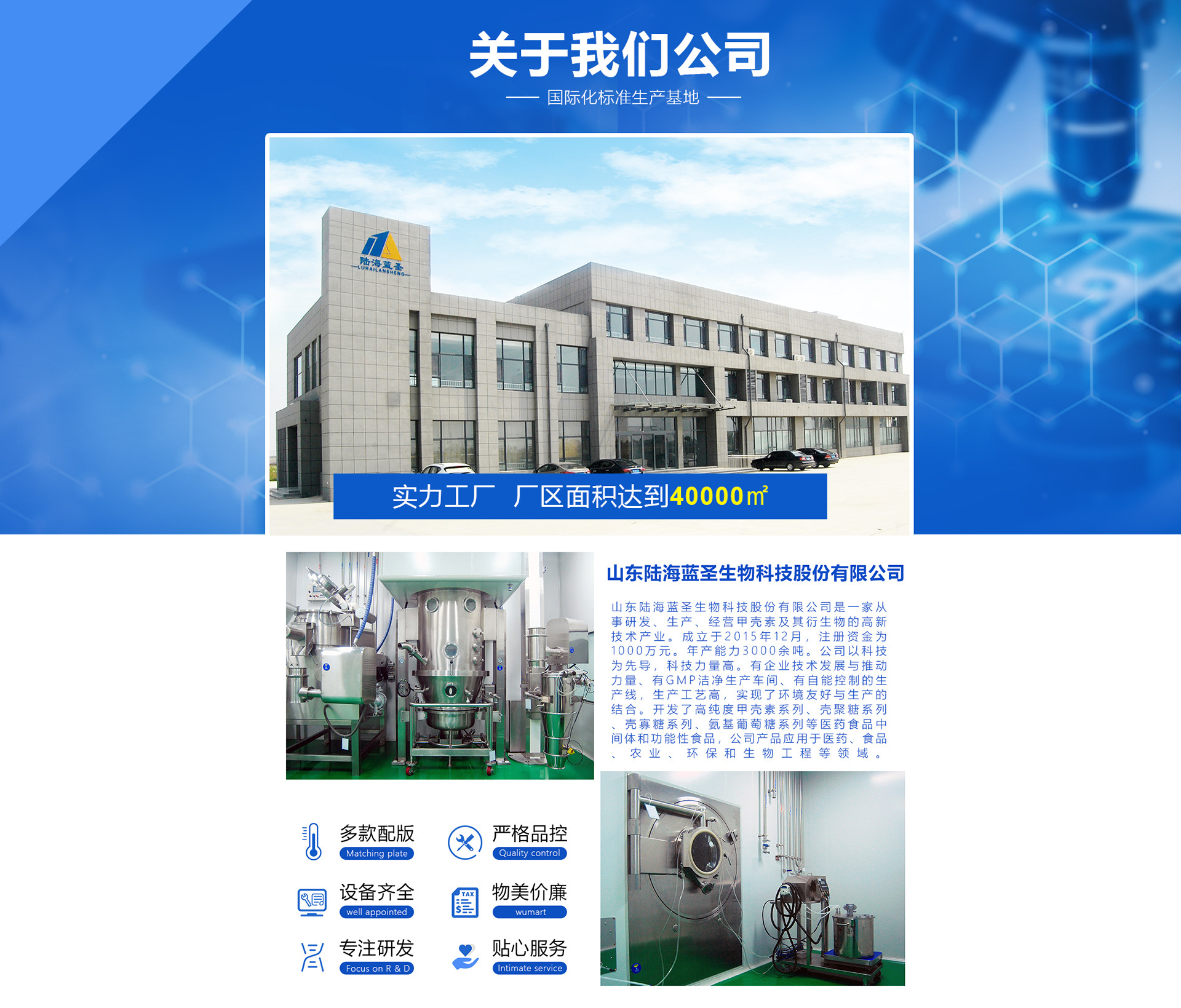山東陸海藍(lán)圣生物科技股份有限公司,位于中國(guó)黃河入海口三角洲的中心城市-東營(yíng)市,注冊(cè)資金2億2千萬元整,是一家從事研發(fā)、生產(chǎn)、加工、銷售于一體的生物高新技術(shù)產(chǎn)業(yè),擁有10萬級(jí)無塵凈化車間,生產(chǎn)線涵蓋粉劑、片劑、膠囊、固體飲料等多條生產(chǎn)線,覆蓋了國(guó)內(nèi)的第三終端、連鎖藥店、線上直播自媒體等多個(gè)銷售渠道,同時(shí)與上海東華大學(xué)等高等院校密切合作,為集團(tuán)提供政策、管理、營(yíng)銷、研發(fā)的高端服務(wù)。