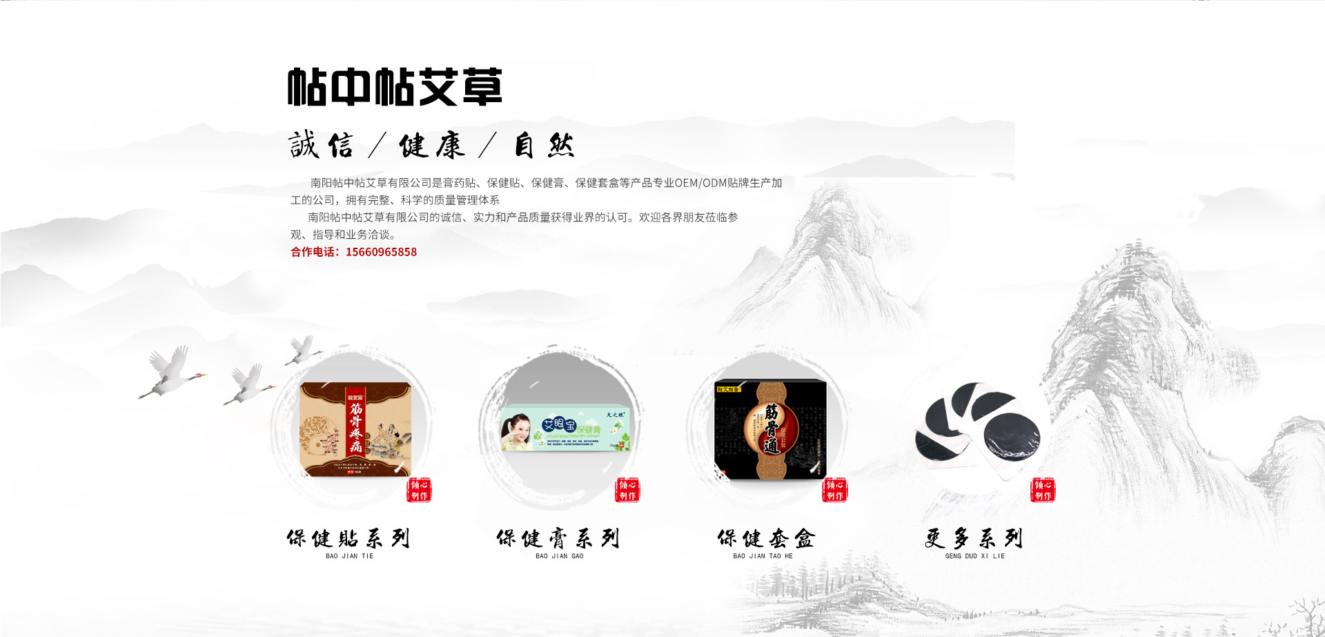 南陽帖中帖艾草有限公司是膏藥貼、保健貼、OEM、ODM等產品專業生產加工的公司,擁有完整、科學的質量管理體系。南陽帖中帖艾草有限公司的誠信、實力和產品質量獲得業界的認可。歡迎各界朋友蒞臨參觀、指導和業務洽談。