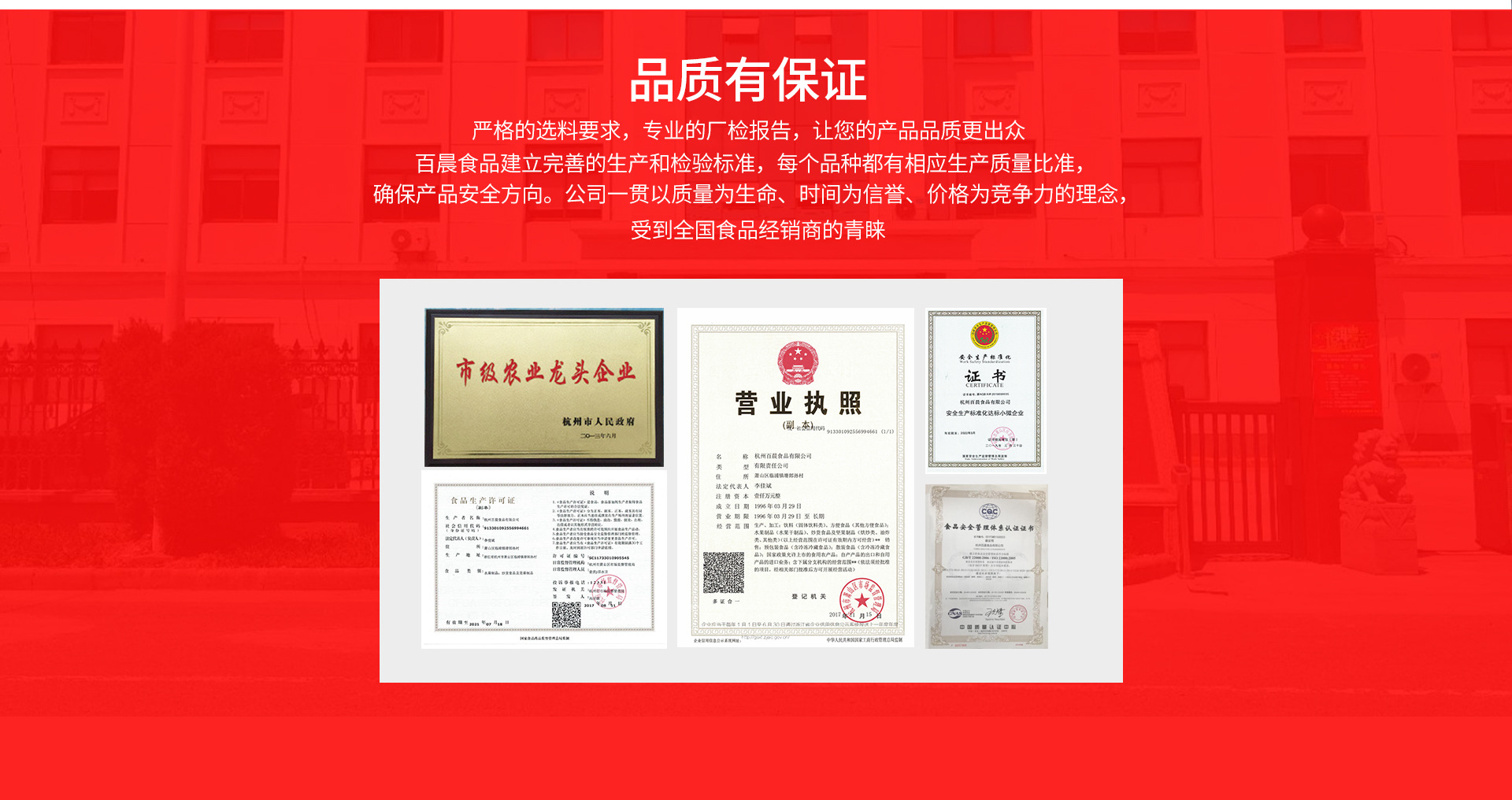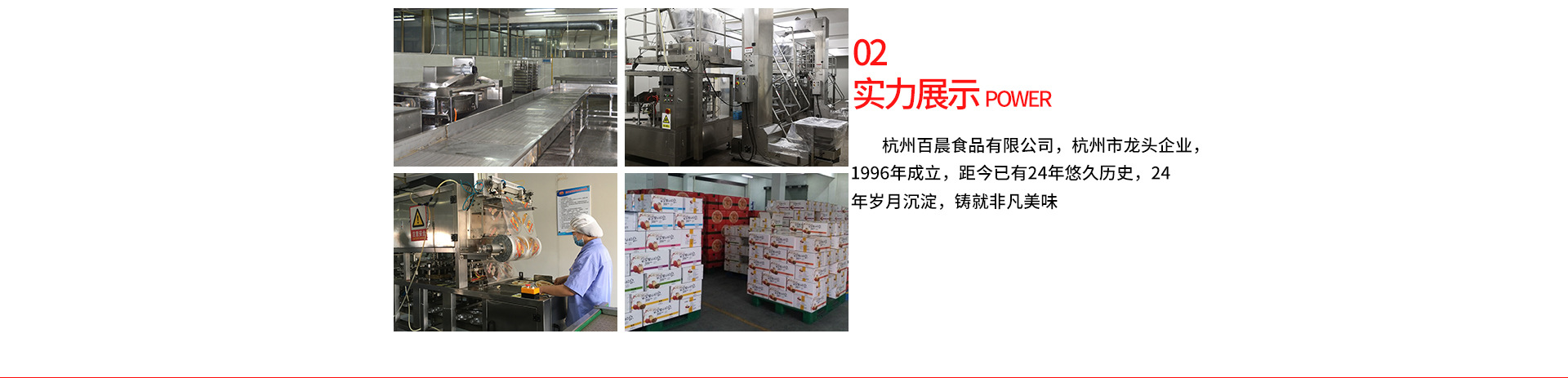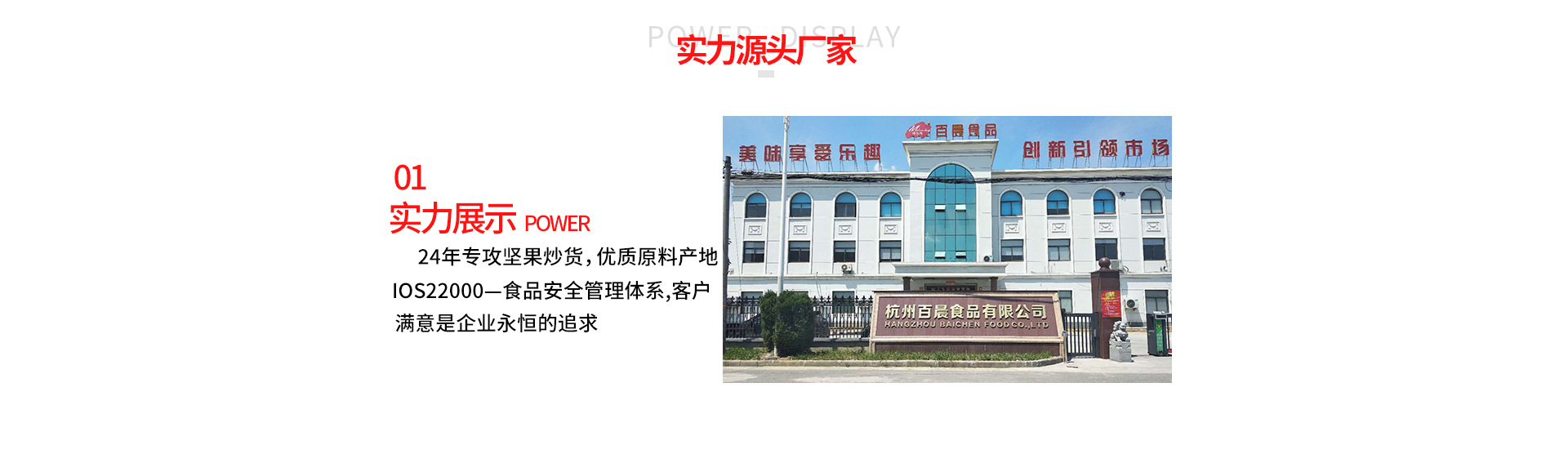 杭州百晨食品有限公司成立于1996年,占地面積33畝,車間辦公等面積11000平方米。杭州市農業龍頭企業公司,全國堅果炒貨協會理事單位。 公司以生產果仁為主,主要做油炸和烘烤兩種工藝,多口味橫向縱向開發,年產量近2000噸。包裝形式多樣,分裝條線豐富,有卷膜顆粒機器分裝線、定量單邊封機器分裝線,定量顆粒分裝線、全自動罐裝線,全自動貼標,人工分裝等多條生產包裝線。 公司擁有獨立研發部門,以開發新口味為己任,不定期根據市場推出自行研發的新品,力爭引導市場,每年都會推陳出新。公司年銷售額2億以上,產品深受全國各地經銷商代理商的喜愛。 公司擁有相對完善的生產質量管理體系,通過22000的生產管理體系認證。 目前跟來伊份、三只松鼠、百草味、洽洽等多個知名品牌供貨或者貼牌,在行業有具有良好的口碑!