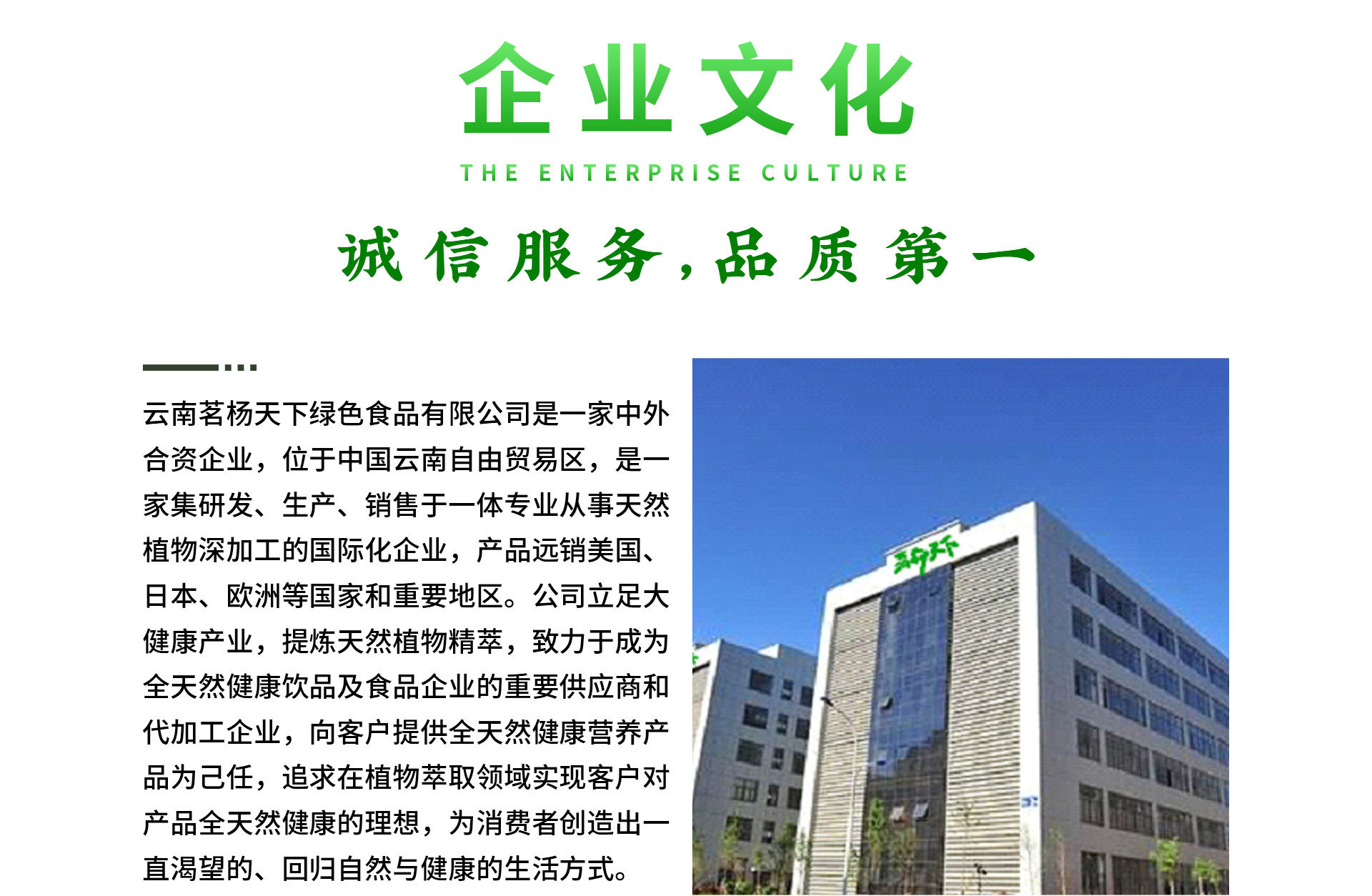 云南茗楊天下綠色食品有限公司位于中國云南昆明自由貿(mào)易區(qū),是一家集研發(fā)、生產(chǎn)、銷售于一體的專業(yè)從事天然植物深加工的國際化企業(yè),產(chǎn)品遠銷美國、日本、歐洲等國家和重要地區(qū)。 公司立足大健康產(chǎn)業(yè),提煉天然植物精萃,致力于成為全天然健康飲品及食品企業(yè)的重要供應商和代加工企業(yè),向客戶提供全天然健康營養(yǎng)產(chǎn)品為己任,追求在植物萃取領域實現(xiàn)客戶對產(chǎn)品全天然健康的理想,為消費者創(chuàng)造出一直渴望的回歸自然與健康的生活方式。