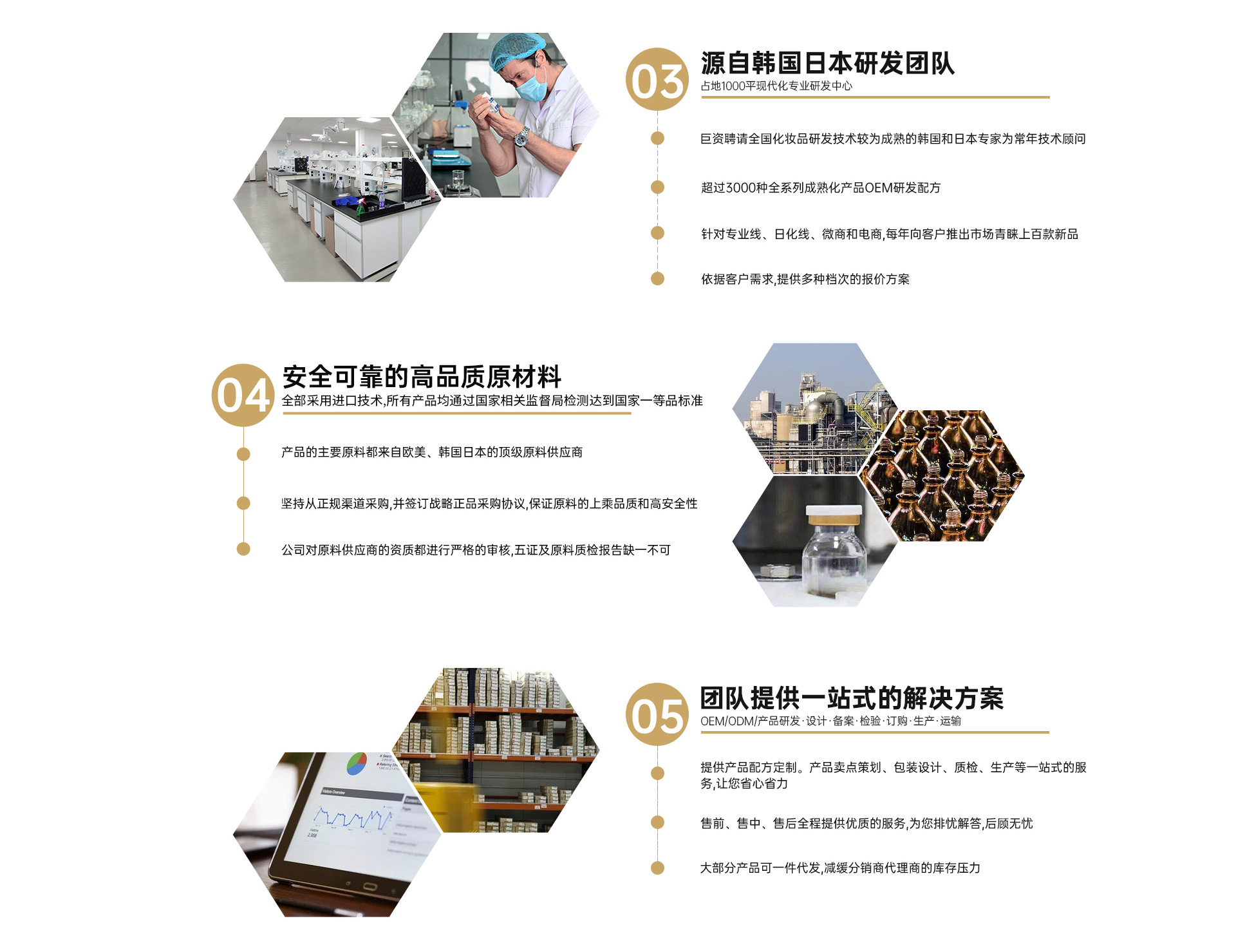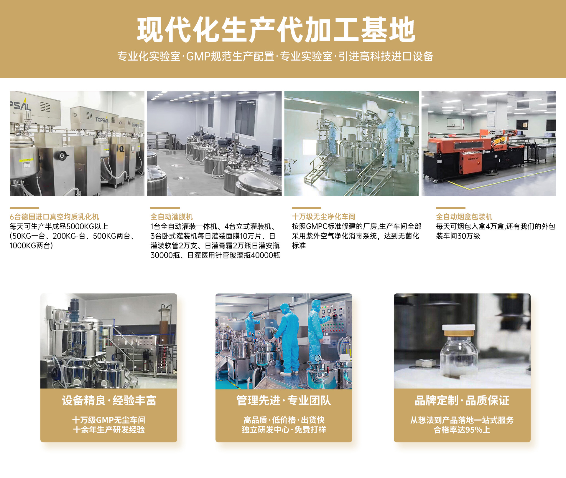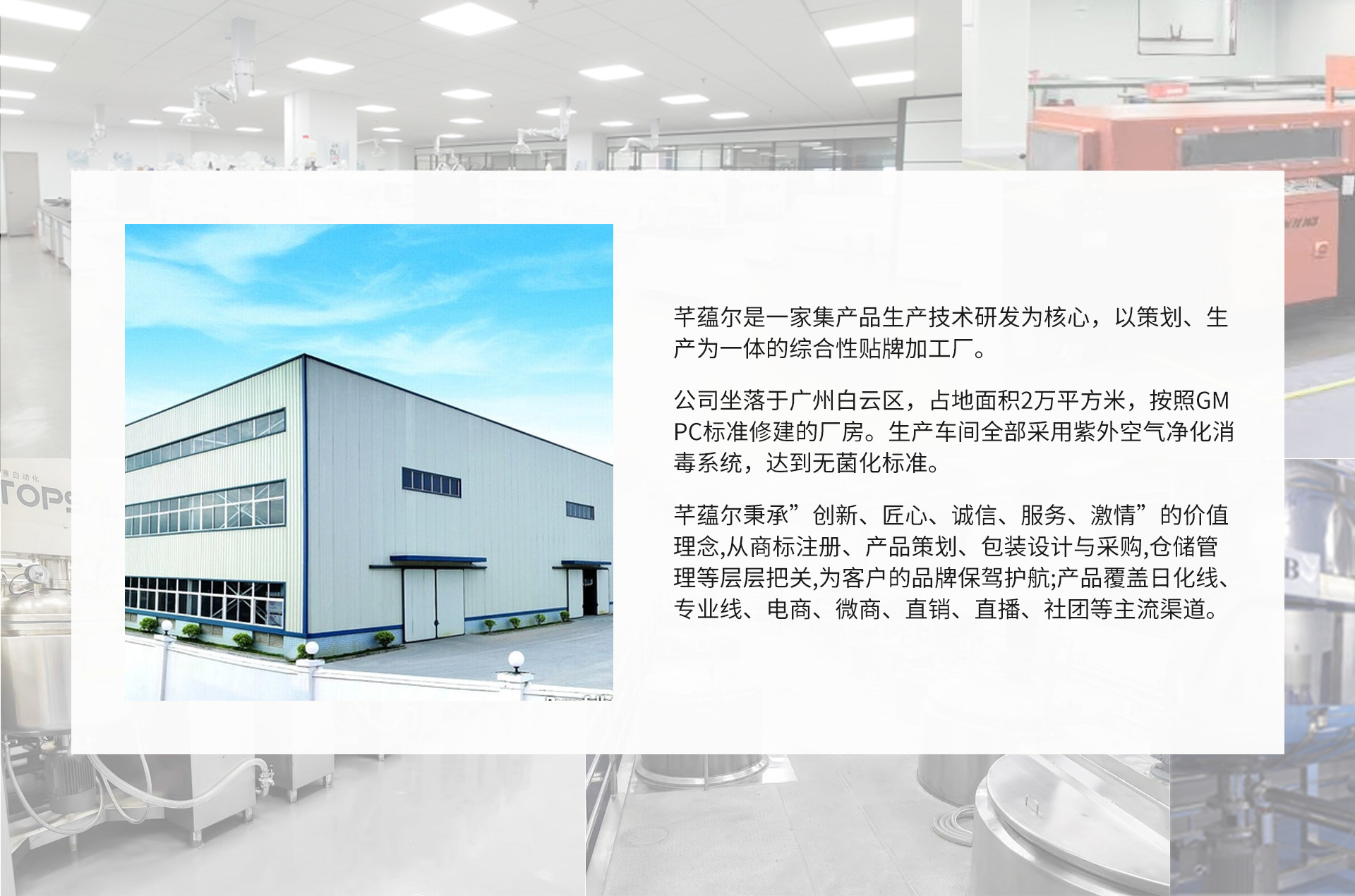 芊蘊爾是一家集產品生產技術研發為核心,以策劃、生 產為一體的綜合性貼牌加工廠。 公司坐落于廣州白云區,占地面積2萬平方米,按照GM PC標準修建的廠房。生產車間全部采用紫外空氣凈化消 毒系統,達到無菌化標準。 芊蘊爾秉承”創新、匠心、誠信、服務、激情”的價值 理念,從商標注冊、產品策劃、包裝設計與采購,倉儲管 理等層層把關,為客戶的品牌保駕護航;產品覆蓋日化線、 專業線、電商、微商、直銷、直播、社團等主流渠道。