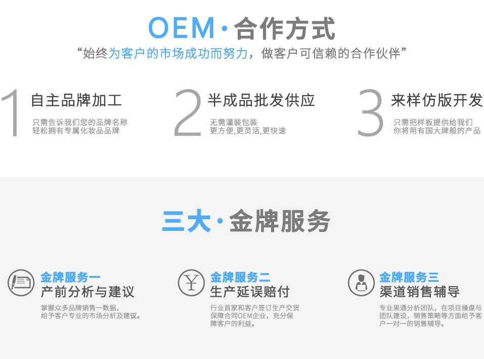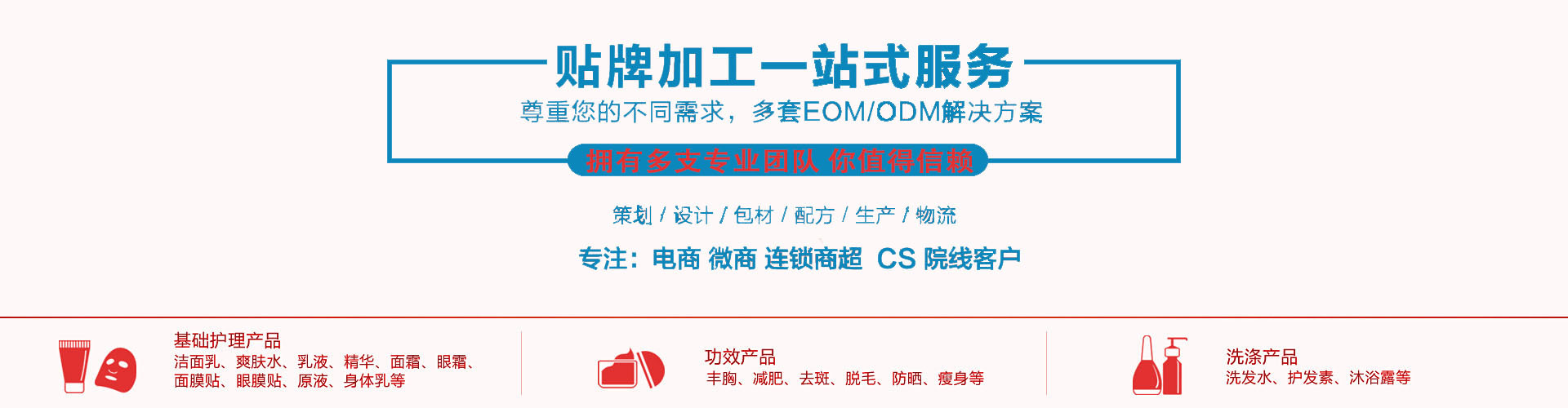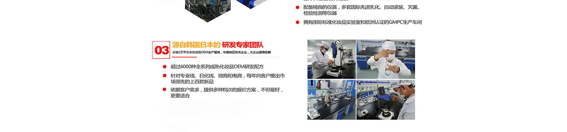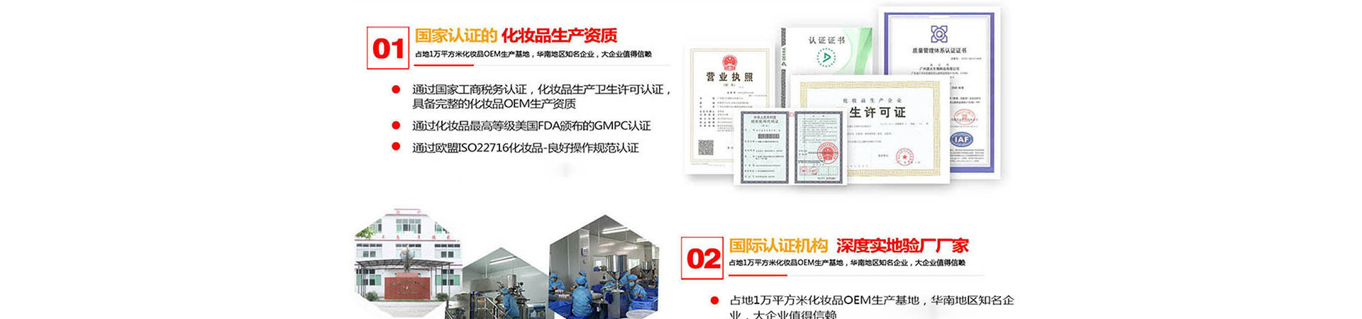 廣州漢妝化妝品廠是一家現代化、流程化、標準化、專業化的化妝品廠家。經過十幾年的經營,從代理并經營國、內外眾多高科技化妝品原料開始,同時一直進行配方研發、臨床、加工、銷售、并以法國多家的研發和生產經驗鑄就了一個中歐式化的、高標準的、現代化的化妝品生產基地、工廠交通便利,座落在廣州市白云區夏良路181號,廠內環境優美、舒適、干凈,總面積達10000多平方米,廠房按準GMP標準建造,引進德國先進的生產技術和實驗設備,配備多條自動化流水作業線,全自動3D封膜(環保膜)機,自動灌裝機,全套的先進真空無菌乳化鍋、攪拌儀等先進的制造設備和檢測儀器;標準的研發中心、微檢中心、質檢室、乳化間、樣品室、加工部、化驗部、原料間等流程空間;擁有自己穩定而精湛的技術研發團隊,管理規范,層層把關,流暢而又嚴謹,已成功通過ISO22716、GMPC質量管理體系認證,歡迎來廠參觀、考察、洽談!漢妝人將時刻恭候您的到來。