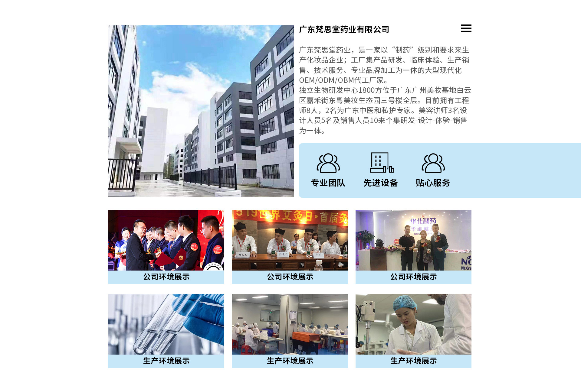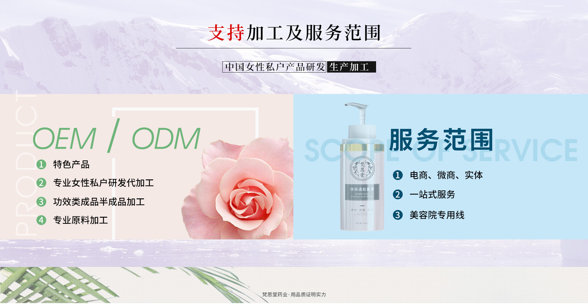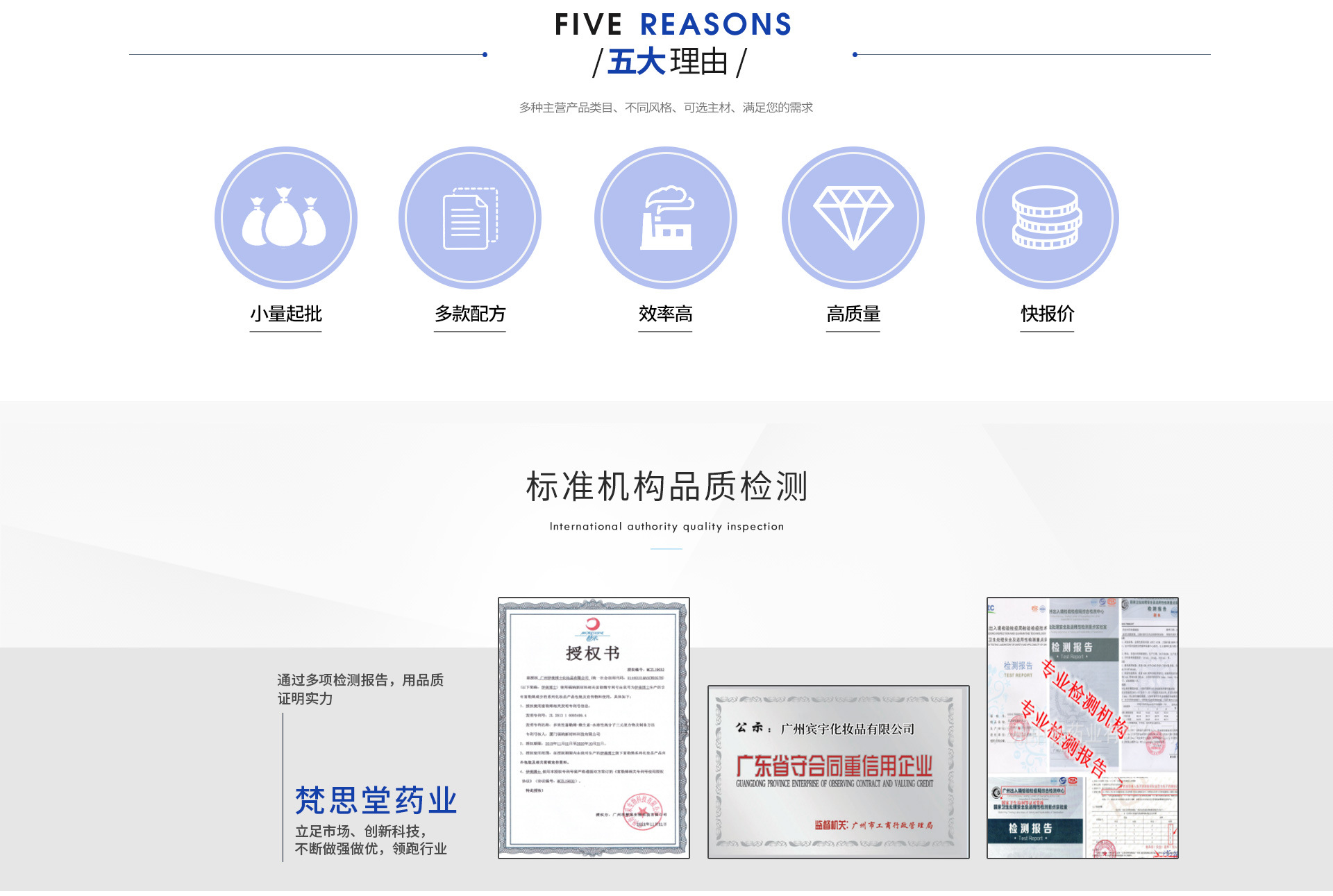 廣州梵思堂藥業有限公司是廣州化妝品OEM/ODM的專業公司,,工廠坐落于廣州市白云區太和鎮南嶺工業區五橫路5號,園區環境優美,綠蔭成林,交通便利,周邊物流發達,是廣州極具理想的化妝品生產基地,5000多平方米的生產基地,近1000平方米的辦公區域,擁有10萬級無菌生產車間和多條國際先進的生產流水線,尖端的研發團隊和高科技人才更具備獨立開發配方、優化配方的卓越實力,引領了化妝品加工行業的最新趨勢,可滿足來自不同國家,不同地區的品牌的訂單生產需求。 公司自成立以來,堅定不移地立足科技創新,潛心產品技術研發,注重產品品質和誠信服務,在不斷的產品研發實踐中積累了豐富的產品設計經驗和生產管理經驗。憑著十年來與眾多品牌的共同協作努力,我們與多個化妝品知名品牌共同為中國的美容事業做出了令人驕傲的貢獻,我們將一如既往的愿同眾多品牌致力于制造出更適合消費者使用的化妝品而努力不懈!