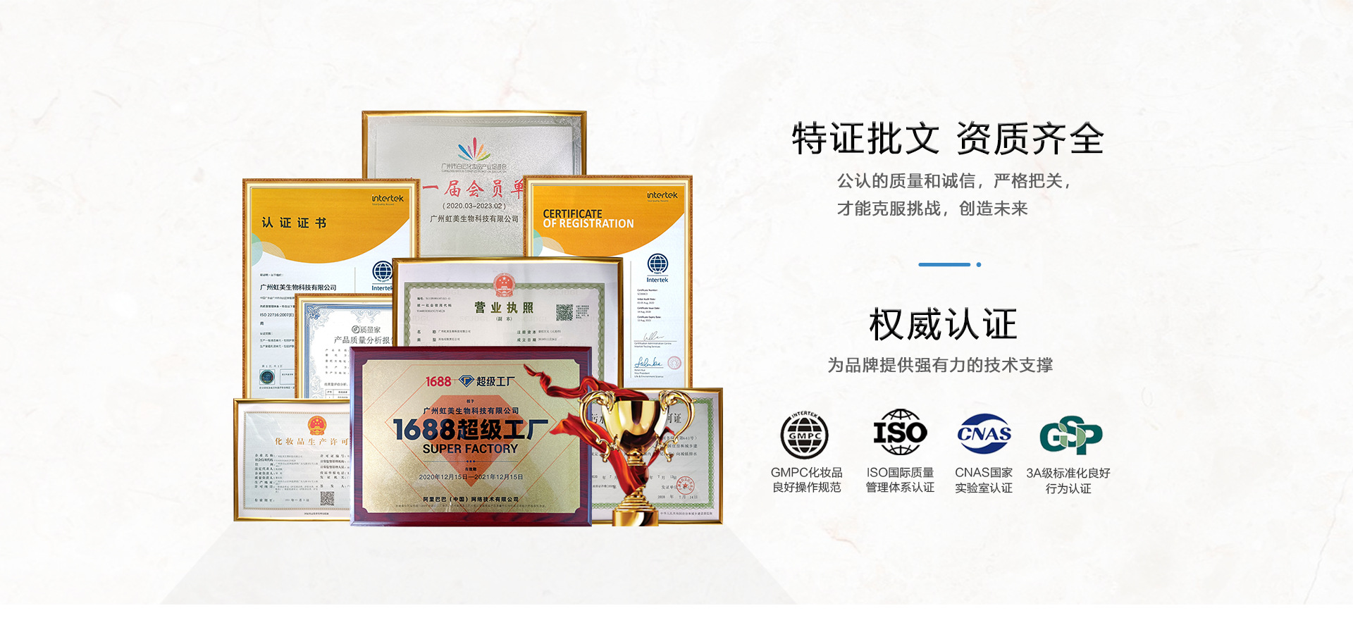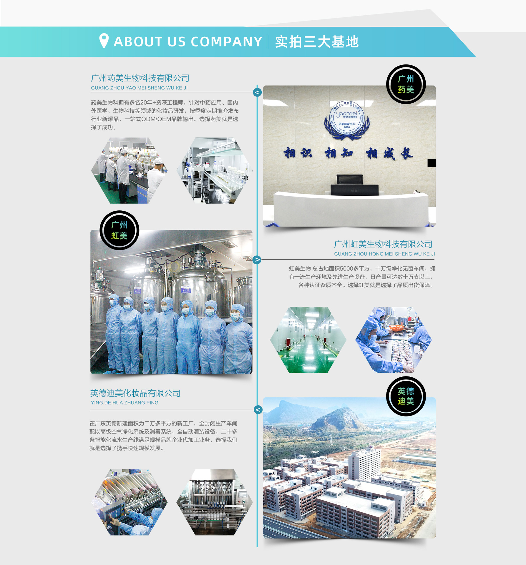 廣州虹美生物科技有限公司是OEM護膚品代工、ODM護膚品代、OEM化妝品代工、ODM化妝品代等產品專業生產加工的公司,擁有完整、科學的質量管理體系。 廣州虹美生物科技有限公司,前身是廣州市顏姬化妝品有限公司,創建于2007年,十四年歷程,2017年公司調整為“雙基地”模式即“藥美研發中心”與“迪美生產基地”; GMPC生產標準,十萬級凈化無菌車間,總占地面積2萬平方,大量先進的生產設備,實現專利成分的高質量生產。 以中藥應用、國內外醫學、皮膚學、生物科技為主導的高新技術企業, 強大的研發團隊,擁有多名業內資深工程師針對中藥應用、國內外醫學、皮膚學、生物科技等領域的化妝品研發。 虹美公司優勢 1、生產優勢 三大生產基地,占地面積為2萬多平方的工廠,生產程序嚴格遵照GMPC生產標準,擁有先進的生產設備及一流生產環境。通過全封閉生產車間配以高級空氣凈化系統及消毒系統,灌裝設備應用氣動裝置
