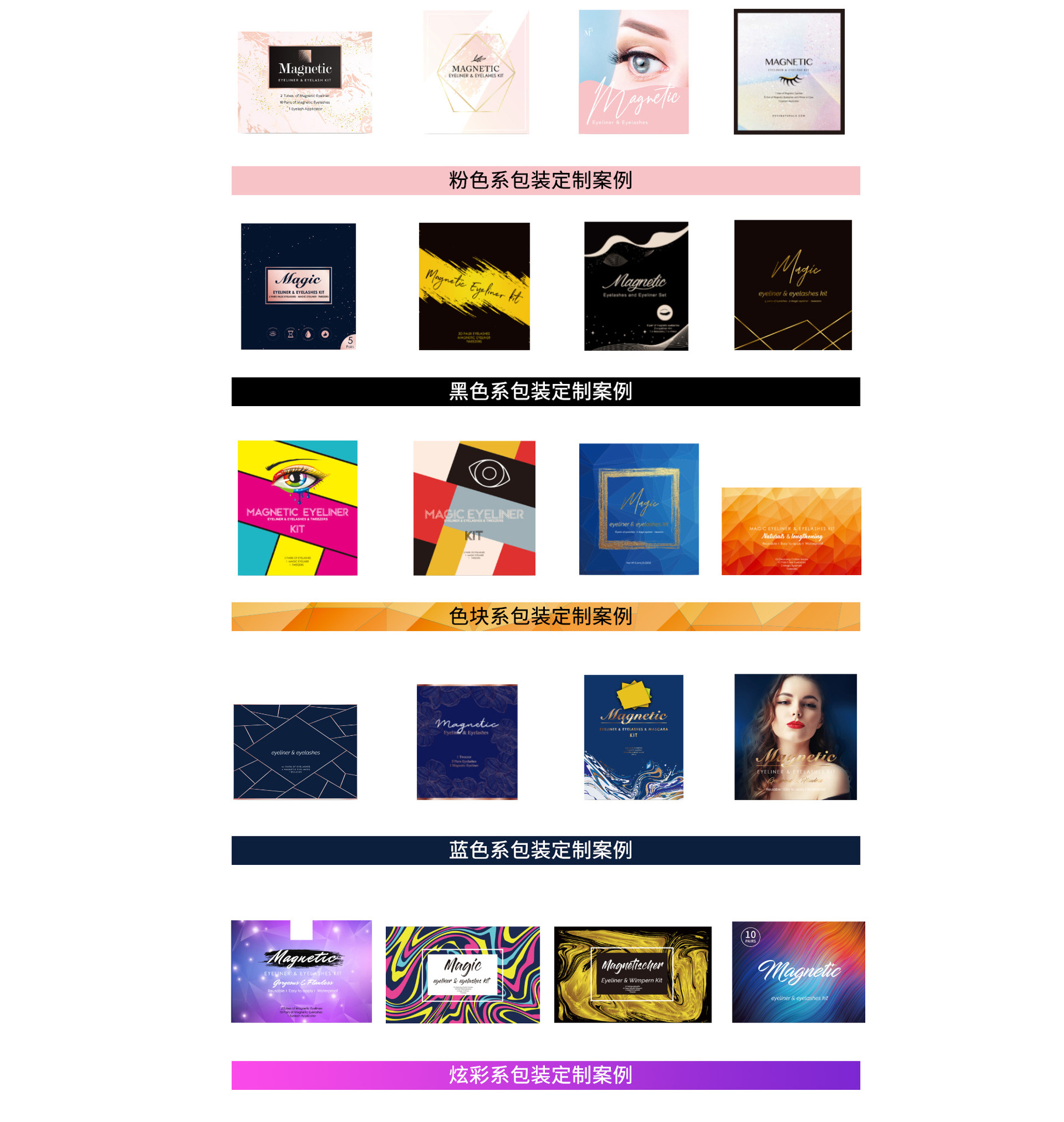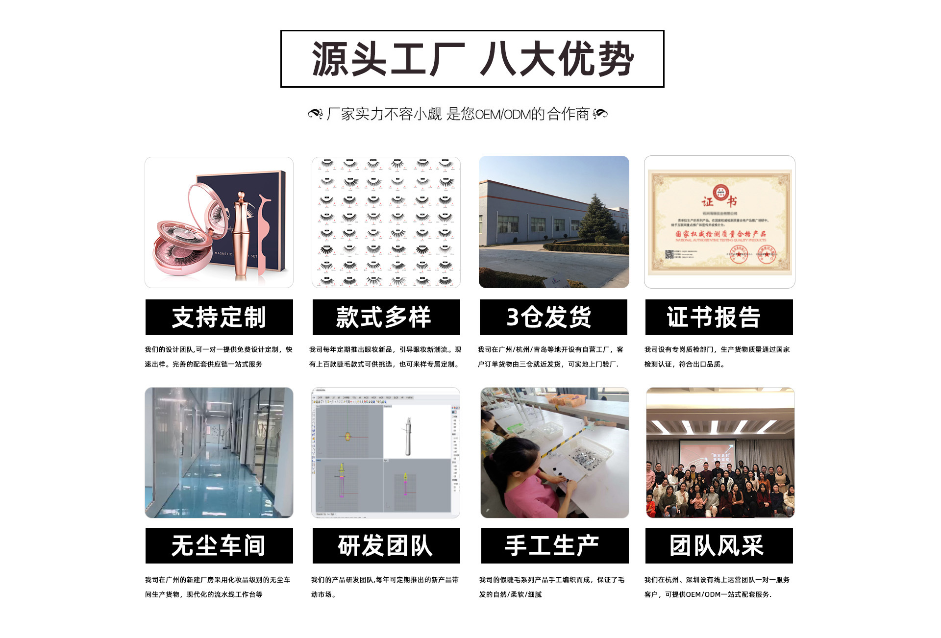 廣州威姿化妝品有限公司是眼睫毛、磁性假睫毛、眼線液、水貂毛假睫毛、自粘假睫毛等各類睫毛產(chǎn)品專業(yè)生產(chǎn)加工的公司。工廠目前擁有專業(yè)化的生產(chǎn)研發(fā)團(tuán)隊(duì),集設(shè)計(jì)、生產(chǎn)、加工、批發(fā)、銷售等全方位服務(wù)于一體的企業(yè)??纱罅繛樗儋u通,wish,亞馬遜等跨境電商平臺和外貿(mào)公司供貨,質(zhì)量保障,貨品齊全,貨源充足,貨期穩(wěn)定 ;也可為業(yè)內(nèi)各品牌客戶提供OEM加工服務(wù)。廣州威姿化妝品有限公司已建立輻射華東、華北、華南區(qū)域的自營工廠,提高快速高效的品質(zhì)服務(wù)給國內(nèi)外客戶!威姿化的誠信、實(shí)力與產(chǎn)品質(zhì)量獲得業(yè)界的認(rèn)可。歡迎各界朋友蒞臨參觀、指導(dǎo)和業(yè)務(wù)洽談。