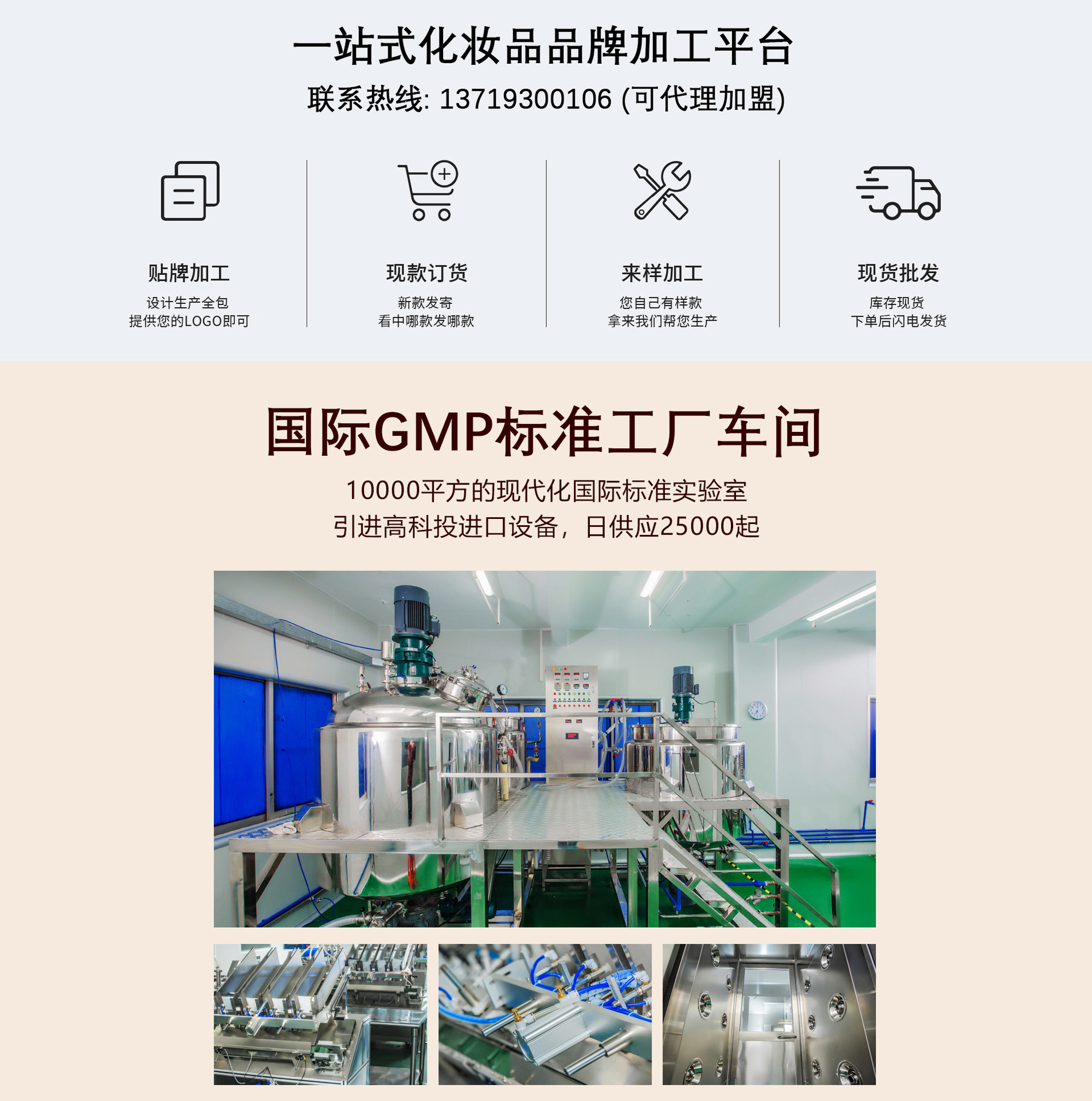 廣州市美意化妝品有限公司成立于2014年,公司坐落于風景秀麗的白云山腳下,占地面積一萬多平方米,環境幽雅,內設辦公樓,宿舍樓,生產廠房,物流倉庫,設施齊全。公司是集產品研究.開發.生產為一體的現代化生產基地,是以OEM/ODM為主的化妝品加工工廠。經過多年的深耕發展現已成為國內外知名的化妝品OEM,化妝品ODM品牌。廠房車間全部按照國家頒布的相關衛生管理條例建設,國際一流無菌的包裝生產線、多臺先進的全自動化灌裝機設備、多套真空乳化設備和先進的C2O超臨界萃取技術。嚴格貫徹GMP生產標準,采用先進的生產技術和設備,所有原料均來自于瑞士、德國和日本等多個國家。并且與國內外多家知名原料廠商,包材供應商簽有協議,將各家優勢集于一體,通過跟我們聯系便可解決您的一切需求。
