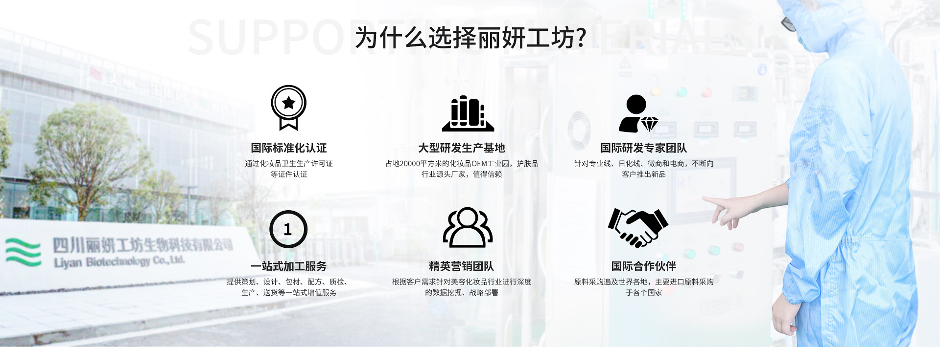 四川麗妍工坊生物科技有限公司隸屬美麗一生集團,我們是一家專業從事化妝品研發、生產、銷售于一體的企業。公司成立于2003年,多年來一直為詩麗堂品牌提供專業院線護膚產品的研發和生產,以其嚴苛的品質要求深受消費者的信任與喜愛。 我們擁有全套現代化高科技的生產加工設備和經驗豐富的研發人員,通過了ISO9001質量體系認證、ISO24001環境管理體系、ISO45001職業健康安全體系三標認證榮,同時已開展GMPC、ISO22716質量體系認證工作;與成都醫學院成立了聯合實驗室,榮獲四川名牌產業稱號。