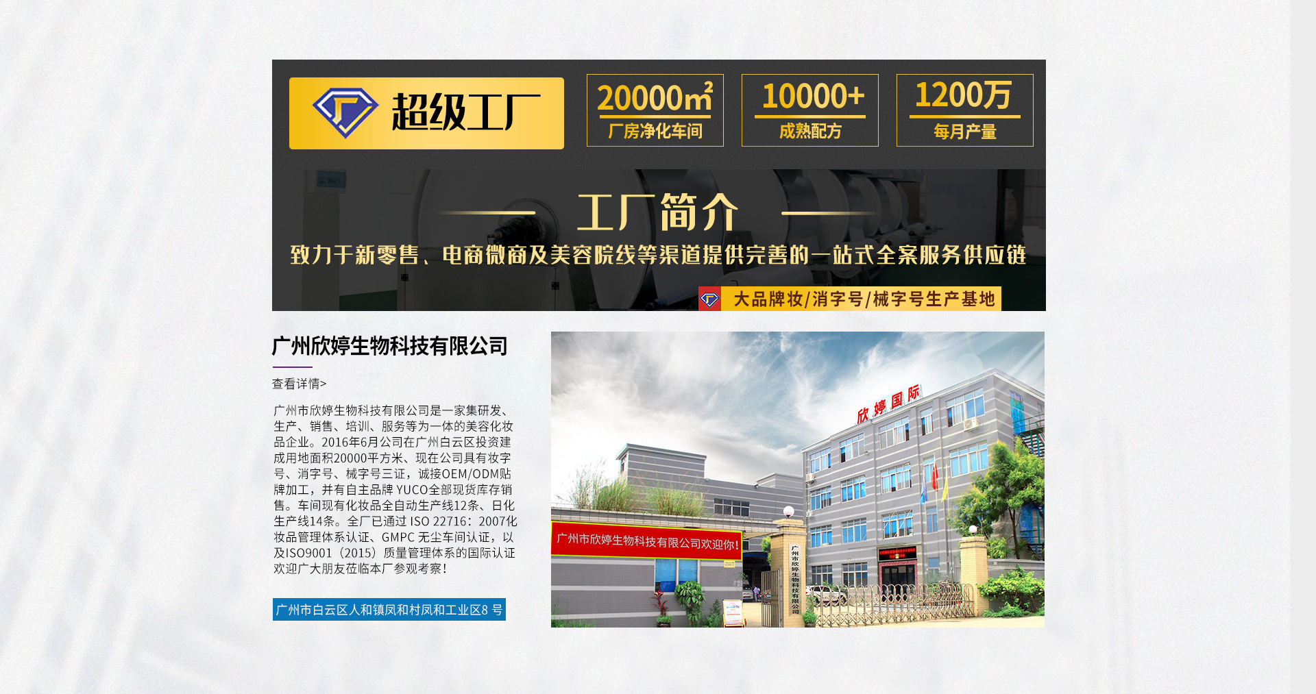 廣州市欣婷生物科技有限公司是一家集研發、生產、銷售、培訓、服務等為一體的美容化妝品企業。2016年6月公司在廣州白云區投資建成用地面積20000平方米、現在公司具有妝字號、消字號、械字號三證,誠接OEM/ODM貼牌加工,并有自主品牌 YUCO全部現貨庫存銷售。車間現有化妝品全自動生產線12條、日化生產線14條。全廠已通過 ISO 22716:2007化妝品管理體系認證、GMPC 無塵車間認證,以及ISO9001(2015)質量管理體系的國際認證