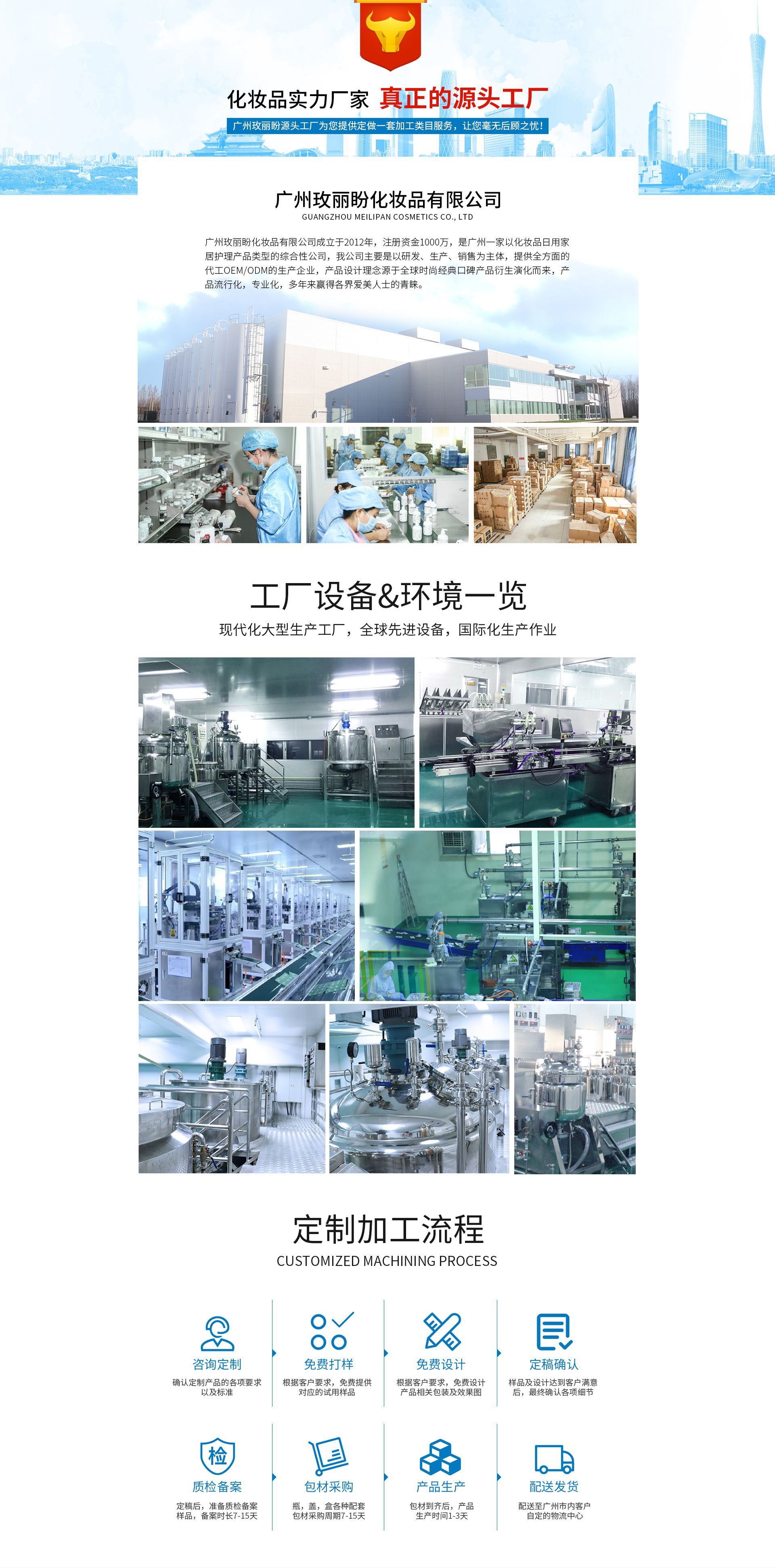 廣州玫麗盼化妝品有限公司是一家集研發與生產為一體的新型公司,我公司主要生產沐浴液、沐浴露、身體乳、護發素、面膜、洗面奶、染發劑,發用類,膚用類等產品專業生產加工的公司,出口周邊國家,承接OEM\ODM,公司自成立以來,始終堅持以人才為本、誠信立業的經營原則,擁有完整、科學的質量管理體系,專業的生產工藝,藥監質的生產車間,歡迎蒞臨參觀、指導和業務洽談。
