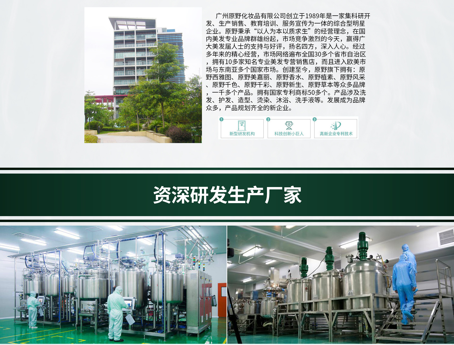 廣州原野化妝品有限公司創(chuàng)立于1989年,是一家集科研開發(fā)、生產(chǎn)銷售、教育培訓、服務宣傳為一體的綜合性明星企業(yè)。從事專業(yè)美發(fā)行業(yè)發(fā)展,自創(chuàng)立以來,原野秉承“以人為本,以質(zhì)求存”的經(jīng)營理念。在當今國內(nèi)美發(fā)專業(yè)品牌“群雄紛起”市場競爭激烈,消費心理日益成熟的今天,“原野”贏得了廣大美發(fā)界人士和消費者的認可、支持與好評。 面對市場及行業(yè)發(fā)展的高低起伏,依然能穩(wěn)步前行。2015年公司精心研制原野沁香絲語精油系列、健康溫和PH 系列, 成功進入商超渠道。兩年穩(wěn)入大潤發(fā),吉之島,天虹,永輝,嘉榮,人人樂,步步高,壹加壹,百佳,華潤萬家,天和,香江百貨,嘉惠連鎖,世紀華聯(lián)等商超系統(tǒng),約5000家商超門店。