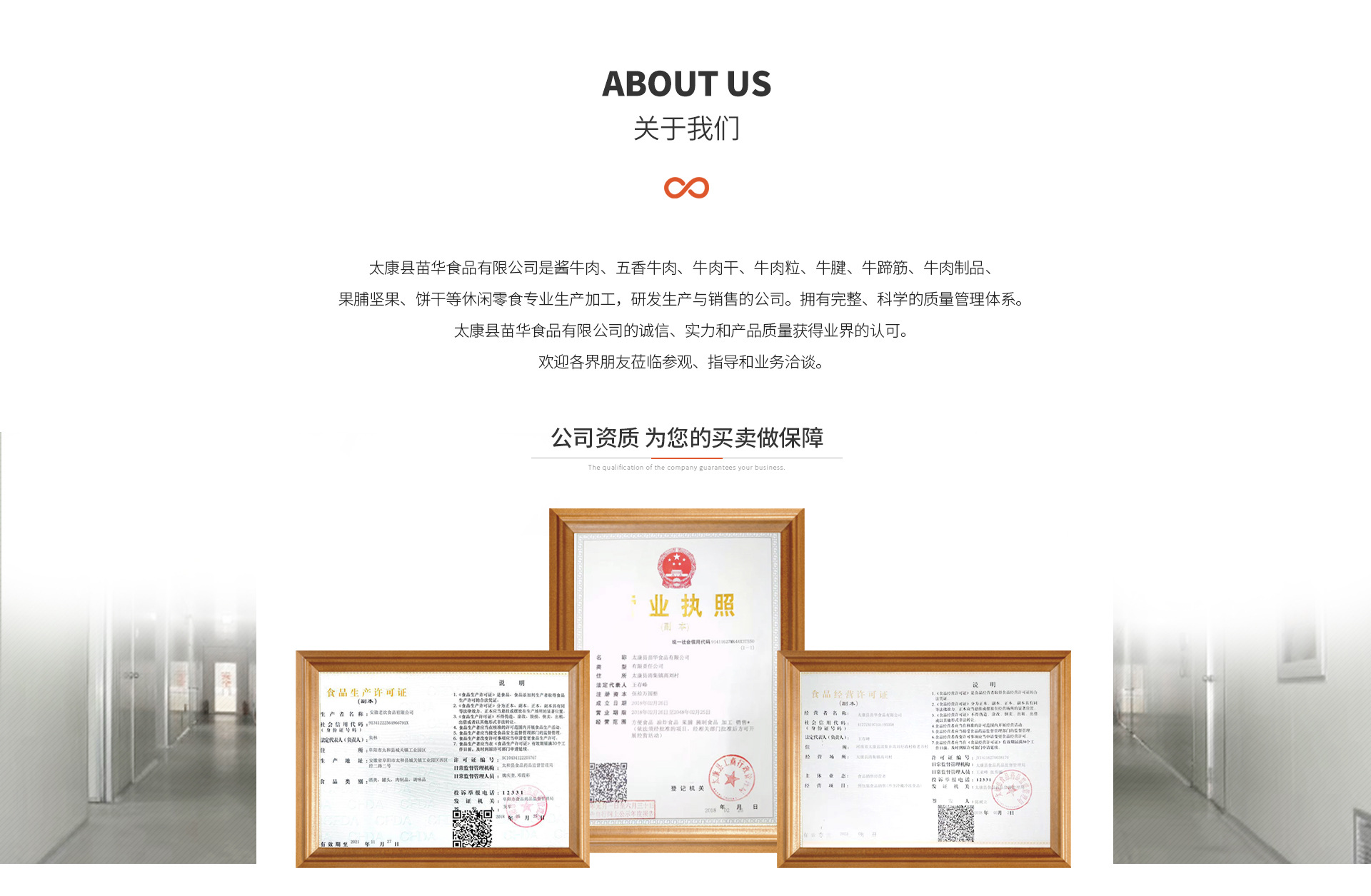 太康縣苗華食品有限公司是醬牛肉、五香牛肉、牛肉干、牛肉粒、牛腱、牛蹄筋、牛肉制品、果脯堅果、餅干等休閑零食專業生產加工,研發生產與銷售的公司。擁有完整、科學的質量管理體系。太康縣苗華食品有限公司的誠信、實力和產品質量獲得業界的認可。歡迎各界朋友蒞臨參觀、指導和業務洽談。