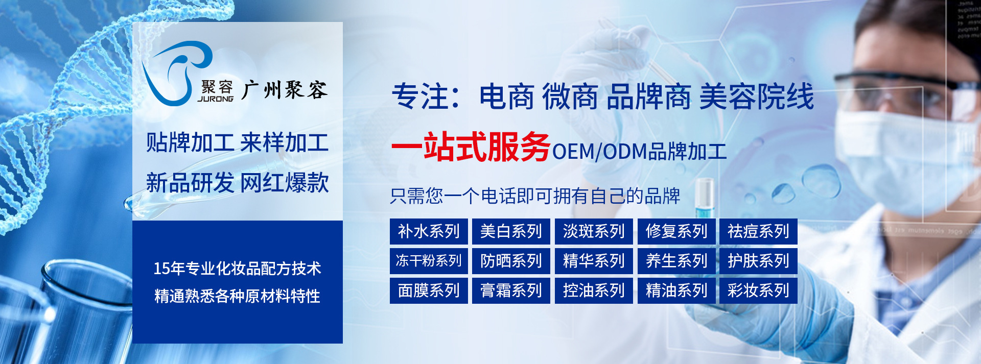 廣州聚容日用品科技有限公司是一家集科研,生產,銷售于一體的大型化妝品生產企業,專業承接OEM/ODM/OBM化妝品代工及為客戶專屬定制。聚容擁有雄厚的技術力量, 1000個以上的成熟配方和制造工藝,以及先進的生產設備和國內一流的生產環境。 聚容科技傾力于專業美發、美容護膚、洗滌、日用品類。以“產品定制專家”為企業發展目標,聚容不斷健全技術標準、管理標準和品牌標準,為客戶提供個性化、標準化的優質服務。 公司創建以來一直注重人才的引進和培養,注重企業內部管理和產品品質,同時,聚容以“誠信、專業、務實、效率、創新”的核心價值,以開拓創新的精神,緊密依托人才與技術優勢,以高素質的核心團隊為基礎,以求真務實的態度,為客戶持續提供優質增值服務和創造價值,為消費者的美麗健康事業貢獻力量。