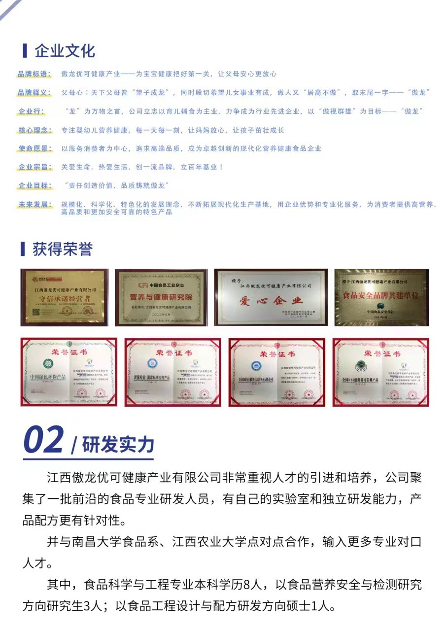 做適合中國寶寶體質的健康營養輔食、奶粉,江西傲龍優可健康產業有限公司在發展過程中,秉承“誠信為本、良心為人”的發展理念,不僅收獲了廣大消費者的信任,更榮獲了眾多榮譽。