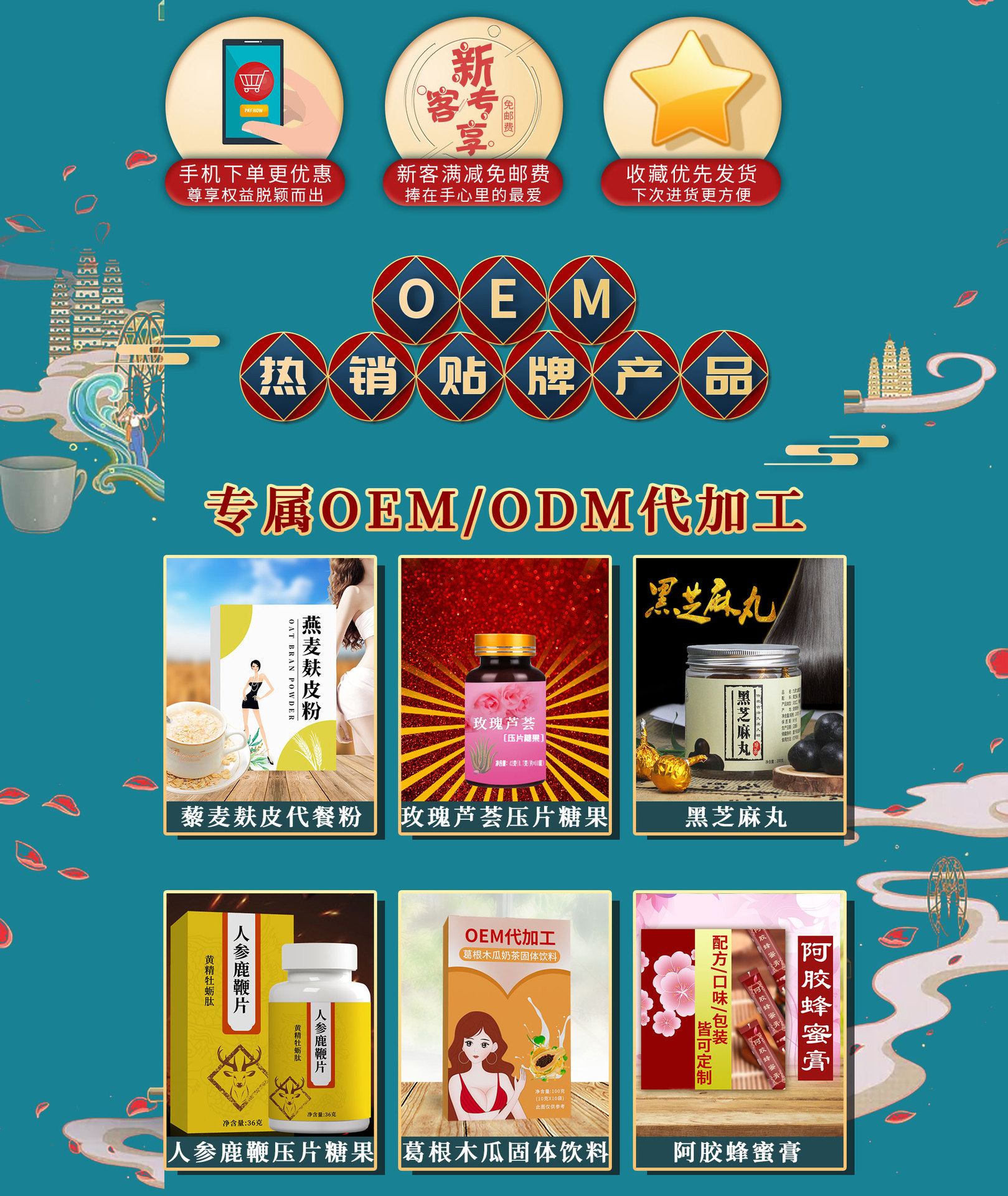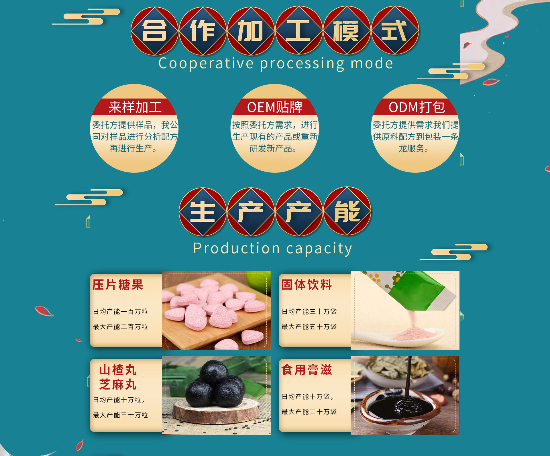 代工品類:丸劑 片劑 粉劑 口服液飲品 軟糖 硬膠囊 軟膠囊 膏滋 調(diào)制乳粉 特殊膳食 普通食品 膏貼 乳膏 噴劑 凝膠 水劑 霜膏