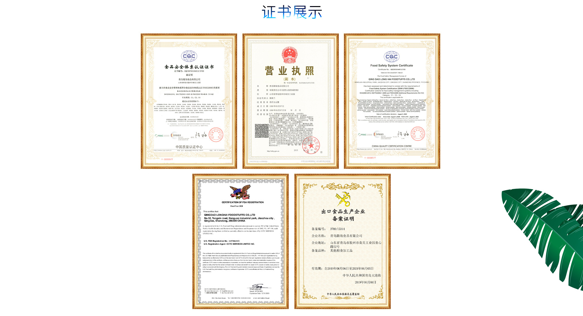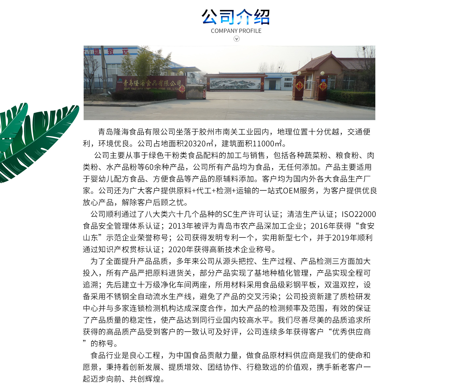 公司主要從事于純天然綠色干粉類食品配料的加工與銷售,包括各種蔬菜粉、糧食粉、肉類粉、水產品粉、薯類粉等60余種產品,主要有:紅棗粉、菠菜粉、胡蘿卜粉、南瓜粉、紫薯粉、豬肝粉、黑米粉、香菇粉、蝦皮粉、豆粉等,公司所有產品均為100%純天然食品,無任何添加。產品主要適用于嬰幼兒配方食品、保健食品、營養食品、方便食品等產品的原輔料添加。客戶遍布全國各地,均為各大知名食品生產廠家,其中不乏世界500強企業。同時,公司還為客戶提供各種產品的代加工業務,實現原料、包裝、檢測、運輸的一站式服務,為客戶解除了后顧之憂。司至今已順利通過八大類六十幾個品種的SC認證;2013年8月被評為青島市農產品深加工龍頭企業; 2013年10月通過青島市清潔生產審核;2014年順利通過ISO22000食品安全管理體系認證;2014年底獲得國家級農業綜合開發產業化經營企業資質2017年通過FSSC22000食品管理體系認證