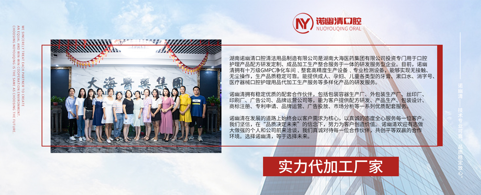 湖南諾幽清口腔清潔用品制造有限公司(以下簡稱:諾幽清)是湖南大海醫藥集團有限公司(以下簡稱:大海集團)投資專門用于口腔護理產品配方研發定制、成品加工生產整合服務于一體的研發服務型企業。目前,諾幽清擁有專業的配套研發實驗室、生產基地,通過嚴謹的研發質量管理體系﹐能提供成人、孕婦、兒童各類型的牙膏、漱口水、消字號、醫療器械口腔護理用品代加工生產服務等多樣化產品的研發服務。
