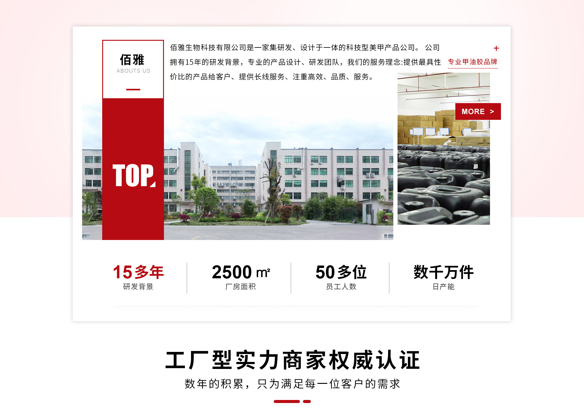 佰雅生物科技有限公司是一家集研發、設計于一體的科技型美甲產品公司。 公司擁有15年的研發背景,專業的產品設計、研發團隊,1300平米標準化無塵車間, 1000平米專業化管理倉庫,為客戶提供高品質的產品,讓客戶享受專業、靈活的物料管理控制。我們的服務理念:提供最具性價比的產品給客戶、提供長線服務、注重高效、品質、服務。