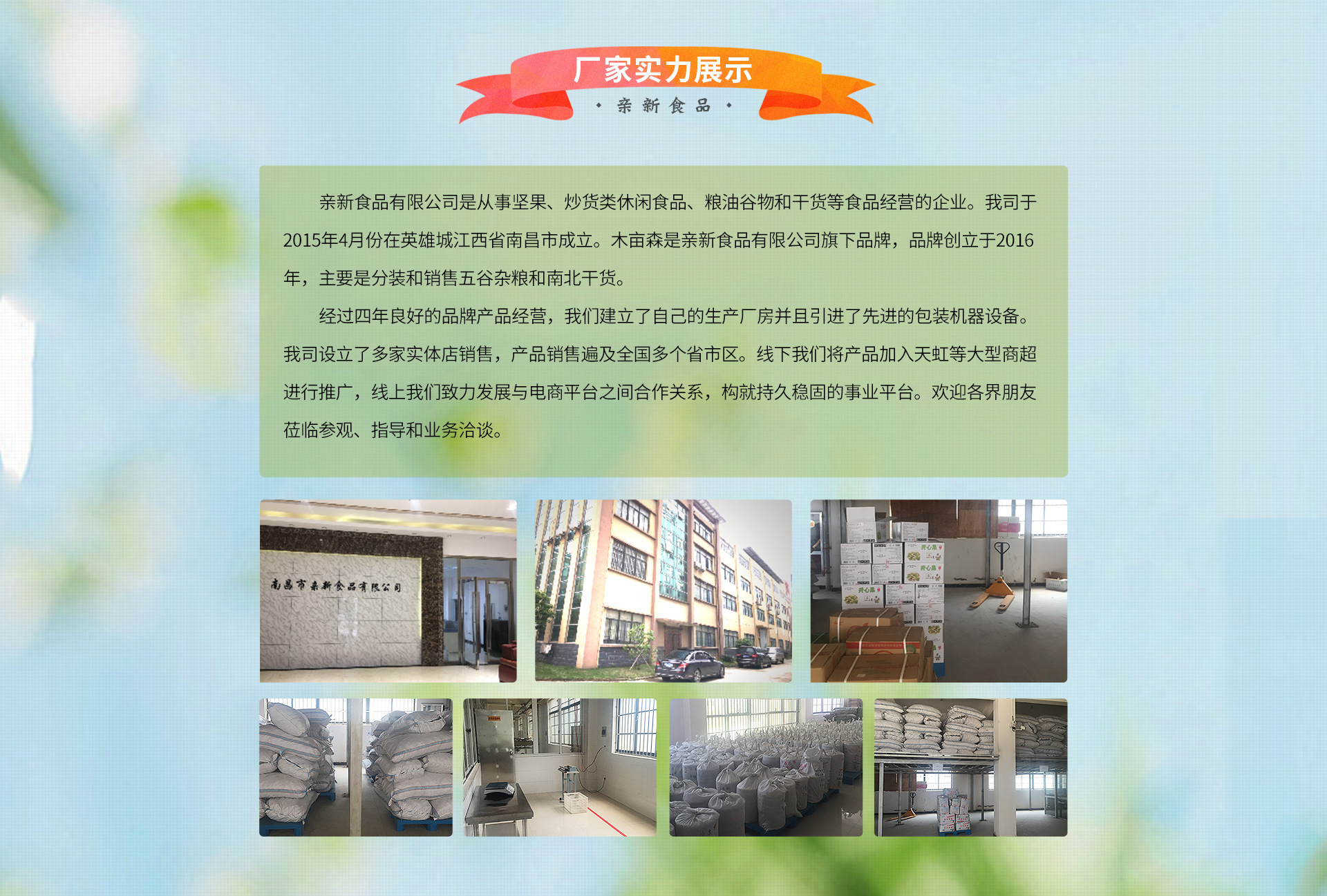 親新食品有限公司是從事堅果炒貨、果干蜜餞、糧油谷物和南北干貨等食品的分裝企業。我司于2015年4月份在英雄城江西省南昌市成立。經過四年良好的品牌產品經營,我們建立了自己的生產廠房并且引進了先進的包裝機器設備。我司設立了多家實體店銷售,產品銷售遍及全國多個省市區。線下我們將產品加入天虹、華潤等大型商超進行推廣,線上我們致力發展與電商平臺之間合作關系,構就持久穩固的事業平臺。