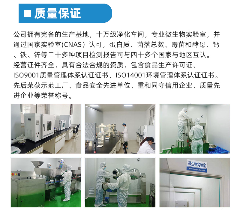 公司擁有完備的生產基地,十萬級凈化車間,專業(yè)微生物實驗室,并通過國家實驗室(CNAS)認可,蛋白質、菌落總數(shù)、霉菌和酵母、鈣、鐵、鋅等二十多種項目檢測報告可與四十多個國家與地區(qū)互認。
