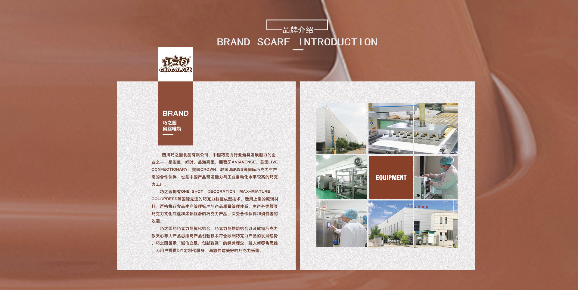 四川巧之園食品有限公司,中國巧克力行業最具發展潛力的企業之一,是雀巢、好時、益海嘉里、葡萄牙Avianense、英國Live Confectionary、美國Crown、韓國Jekiss等國際巧克力生產商的合作伙伴,也是中國產品研發能力與工業自動化水平較高的巧克力工廠。 巧之園擁有One Shot、Decoration、Max-Miature、Coldpress等國際先進的巧克力數控成型技術,選用上乘的原輔材料,嚴格執行食品生產管理標準與產品質量管理體系,生產各類頗具巧克力文化底蘊和濃郁絲滑的巧克力產品,深受合作伙伴和消費者的歡迎。 巧之園的巧克力與膨化結合、巧克力與烘焙結合以及軟糖巧克力軟夾心等大產品思維與產品創新技術符合歐洲巧克力產品的發展趨勢,巧之園秉承“誠信立足、創新致遠”的經營理念,融入新零售思維,為用戶提供DIY定制化服務。