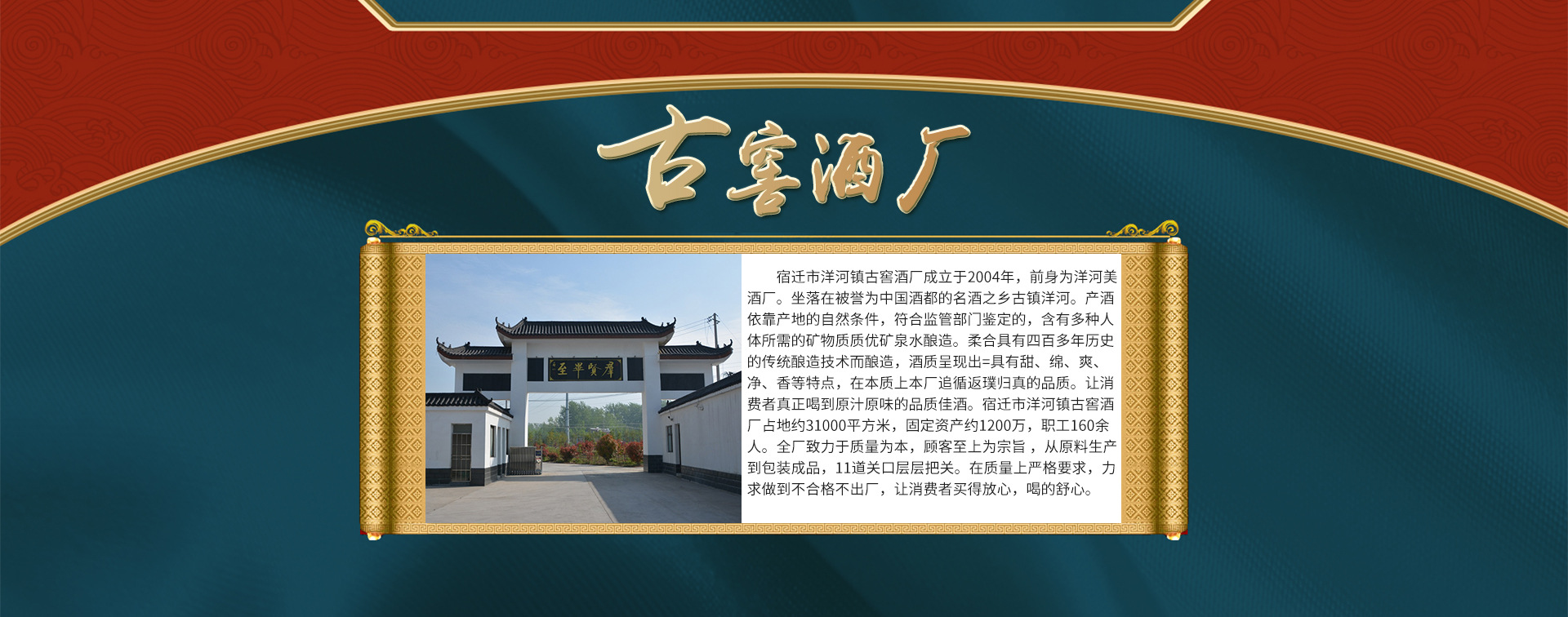 宿遷市洋河鎮古窖酒廠成立于2004年,前身為洋河美酒廠。坐落在被譽為中國酒都的名酒之鄉古鎮洋河。產酒依靠產地的自然條件,符合監管部門鑒定的,含有多種人體所需的礦物質質優礦泉水釀造。柔合具有四百多年歷史的傳統釀造技術而釀造,所以酒質呈現出具有甜、綿、爽、凈、香等特點,在本質上本廠追循返璞歸真的品質。讓消費者真正喝到原汁原味的品質佳酒。宿遷市洋河鎮古窖酒廠占地約31000平方米,固定資產約1200萬,職工160余人。全廠致力于質量為本,顧客至上為宗旨 ,從原料生產到包裝成品,11道關口層層把關。在質量上嚴格要求,力求做到不合格不出廠,讓消費者買得放心,喝的舒心。