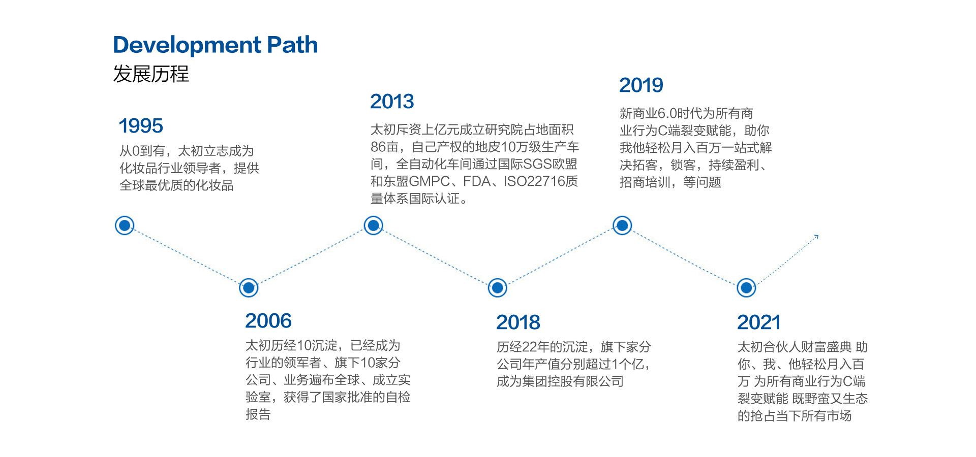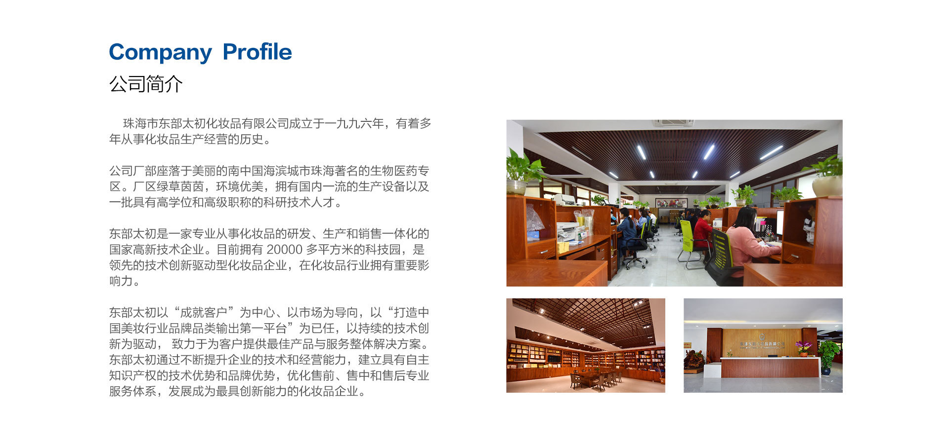 珠海市東部太初化妝品有眼公司成立于1996年,是一家專業從事化妝品的科研、開發、生產、營銷服務、文化教育 為一體化的國家高新技術企業。目前擁有20000多平方米的科技園,是領先的技術創新驅動型化妝品企業,在化妝 品行業擁有重要影響力。公司廠部座落于美麗的南中國海濱城市珠海著名的生物醫藥專區,廠區綠草茵茵,環境優 美,擁有國內一流的生產設備以及一批具有高學位和高級職稱的科研技術人才,創新核心JDM —體化參與性品牌 深度戰略合伙人模式(聯合設計制造)更是打破了護膚代工行業的壁壘,更好、更緊密、更貼近市場與客戶所需注 重技術研發和創意團隊建設,致力于全球資源整合,如合作品牌、專業研發機梅、優秀的策劃設計團隊。集團旗下 有3家子公司、享譽國際一韓國蘭芝(丹迪蘭)品牌:野蠻生態聚商系統就是由馨鮮生物科技有限公司主要負責運營, 通過三大平臺;四大臺階;6個聚商圈;讓整個美容行業回歸行業初心。