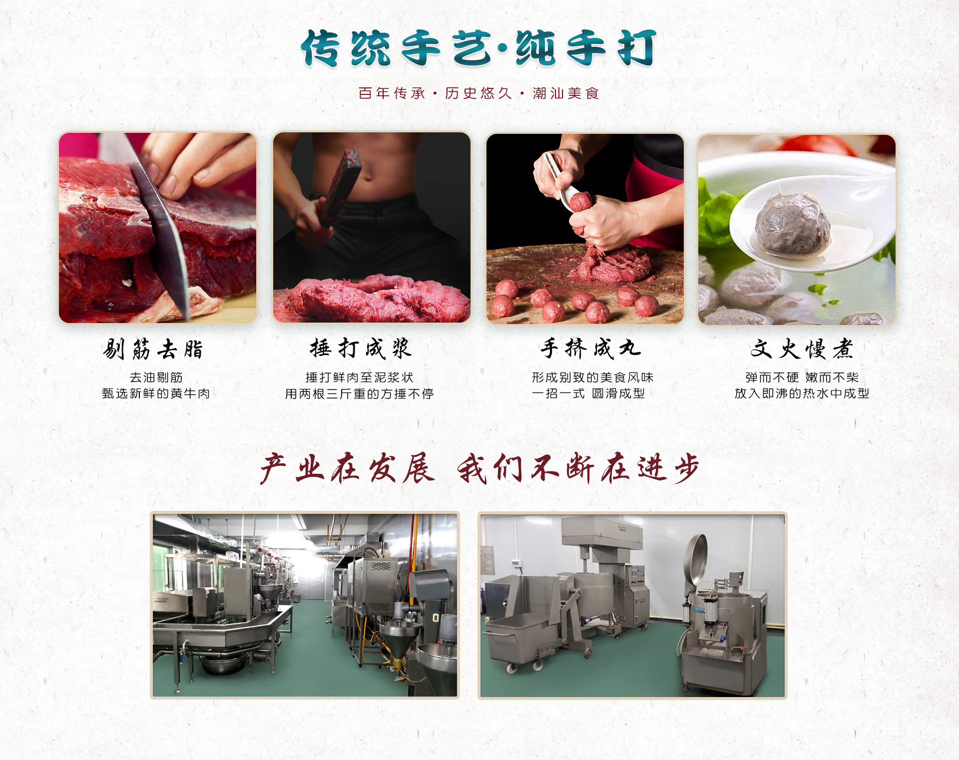正規廠家(有SC認證)自產直銷,沒有中間加價,品質穩定,衛生嚴控,不添加任何防腐劑、助鮮劑,產品堅持傳統手工工藝作業,保質保量,不定時接受食藥監局抽查檢驗,食品安全有保證; 如果您也從事相關餐飲或銷售業務,歡迎來電交流洽談,0754-88879996/13829666099(也是WEIXIN號),我們的客戶覆蓋酒店,火鍋店,小吃店,超市,批發商,網絡運營商等等,支持一件代發;我們的批發門檻低,操作專業,期待您的加盟。 我們是牛肉丸世家,創業、正規化品牌化運作也已六個年頭,我們也是年輕的80后,傳承發揚潮汕美食文化是我們永恒的追求——“百年潮香”,簡短的四字品牌包含了多少在故鄉和赴他鄉“家己人”不變的情懷,讓我們一起,傳播美食,共創嘉業。