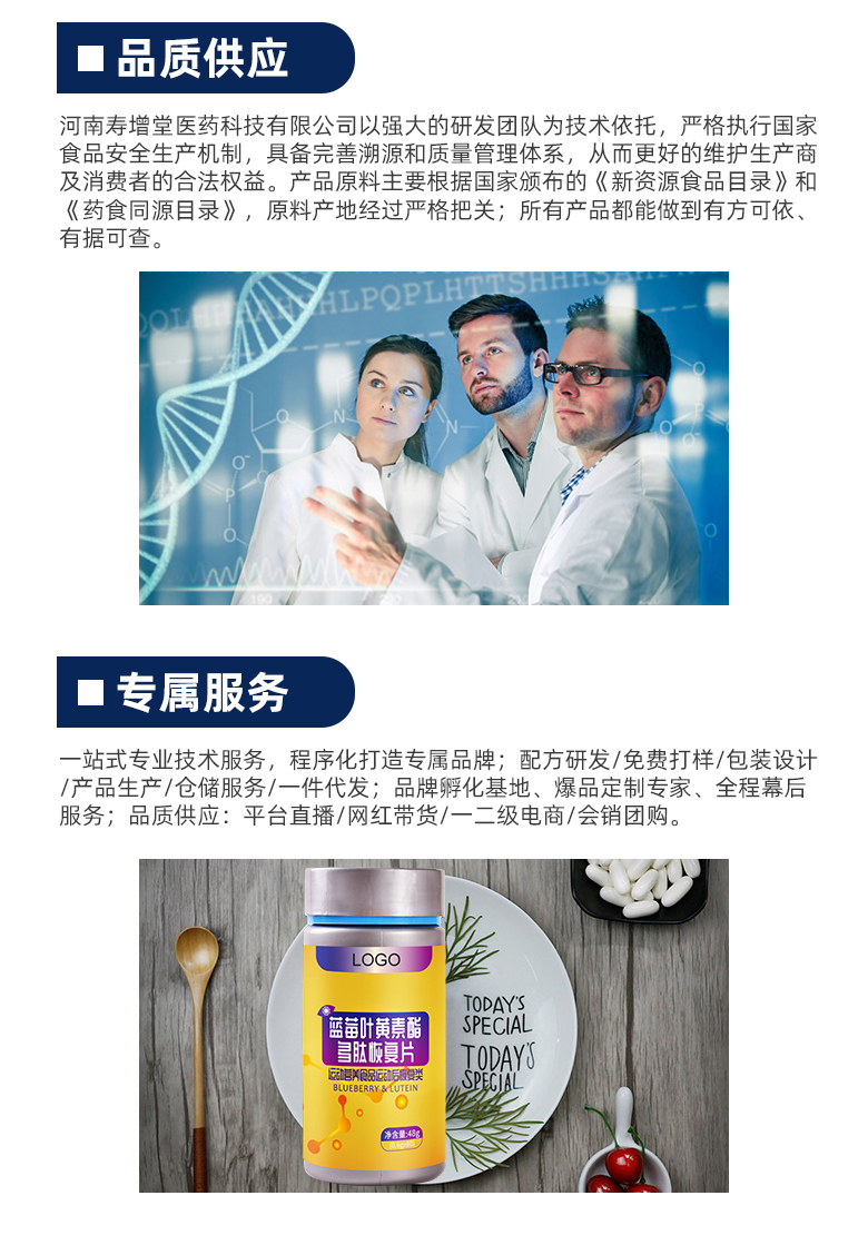 河南壽增堂醫藥科技有限公司是一家大型綜合性健康食品及生物技術服務企業,主營保健食品、營養食品生產加工OEM、ODM,招商加盟等業務。2021年重新整合多家食品、保健品生產企業,強強聯合,資源共享。公司斥資打造了占地面積達數萬余平米的全新現代化高標準保健食品生產廠區,自主物業,獨立廠房。引進多臺高科技生產設備,擁有國際標準化實驗室,配備先進實驗研發設備,與國內一線高校人才合作組建專業研發團隊,實行研產一體化,針對不同方向的營養保健課題進行探討研究,并將科研成果轉化為生產力,為產業化生產提供技術支撐。公司管理層均有多年以上保健食品、食品、質量管理方面的從業資歷,管理經驗豐富,為企業長久發展提供保障。河南壽增堂醫藥科技有限公司以強大的研發團隊為技術依托,嚴格執行國家食品安全生產機制,具備完善溯源和質量管理體系,從而更好的維護生產商及消費者的合法權益。產品原料主要根據國家頒布的《新資源食品目錄》和《藥食同源目錄》,原料產地經過嚴格把關;所有產品都能做到有方可依、有據可查。目前公司產品涵蓋壓片糖果、凝膠糖果、固體飲料、軟膠囊、方便食品、特膳食品等多類產品,上千種細類產品。實力供應平臺直播/網紅帶貨/一二級電商/電商團購等線上線下銷售平臺,是從事營養食品、保健食品OEM、ODM的優選合作伙伴。