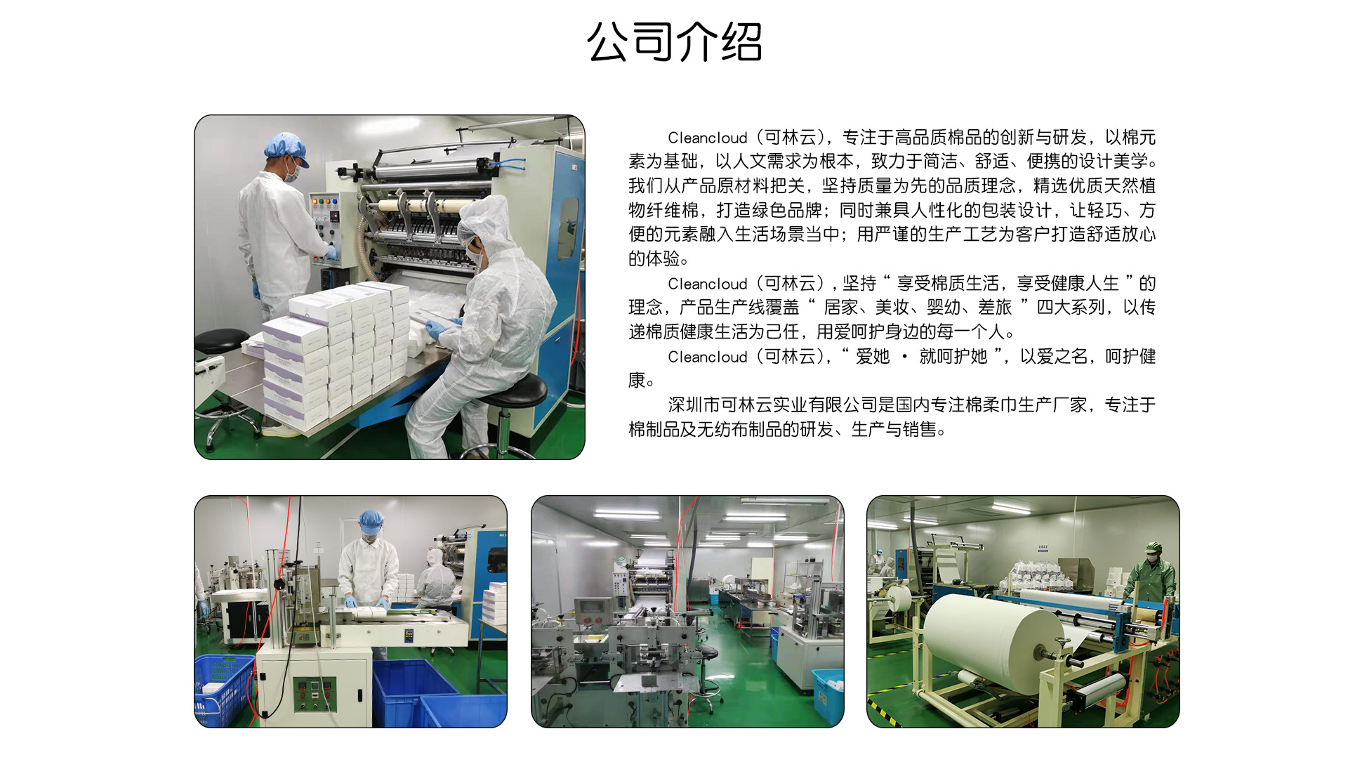 深圳市可林云實業(yè)有限公司,是一家專業(yè)生產(chǎn)一次性棉制品(潔面巾、棉柔巾、一次性毛巾、一次性浴巾、一次性床單、懶人抹布、美妝棉簽、卸妝棉簽)以及無紡布制品的生產(chǎn)廠家。目前已開發(fā)產(chǎn)品種類20余種,并在不斷地研發(fā)新的產(chǎn)品。公司擁有全自動化生產(chǎn)線20余條,百級凈化車間以及無塵車間3000平。公司擁有30人的高學(xué)歷高水平的管理團隊,科學(xué)嚴(yán)謹(jǐn)?shù)墓芾韴F隊及生產(chǎn)團隊。專業(yè)的潔凈生產(chǎn)車間,先進的生產(chǎn)設(shè)備和檢測設(shè)備,標(biāo)準(zhǔn)化的生產(chǎn)工藝,嚴(yán)謹(jǐn)?shù)钠焚|(zhì)管理,精益求精,我們始終在努力